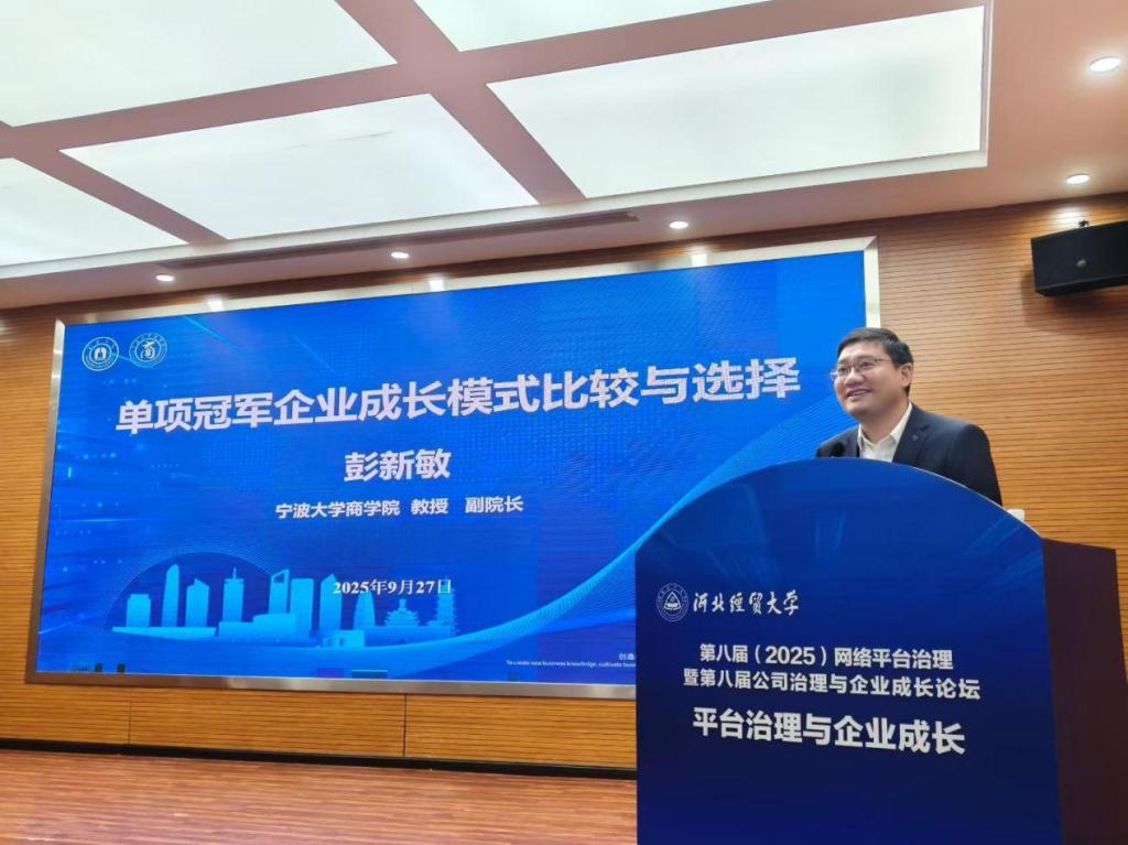 宁波大学商学院副院长彭新敏教授作题为“单项冠军企业成长模式比较与选择”的主题报告。他从中国制造业规模全球第一的宏观背景与宁波“单项冠军之城”的实践切入,深入剖析了单项冠军企业在创新与效率之间面临的战略悖论,提出创新引领型、效率赋能型与双轮驱动型三种典型成长模式,并基于技术机会、知识复杂性等维度,对永新光学、激智科技、海天塑机三家冠军企业进行了系统比较。该研究构建了“行业技术体制—企业成长模式”的创新分析框架,揭示了企业依托自身技术基础选择成长路径的内在逻辑,为专精特新企业突破成长瓶颈提供了理论指引与实践参考。