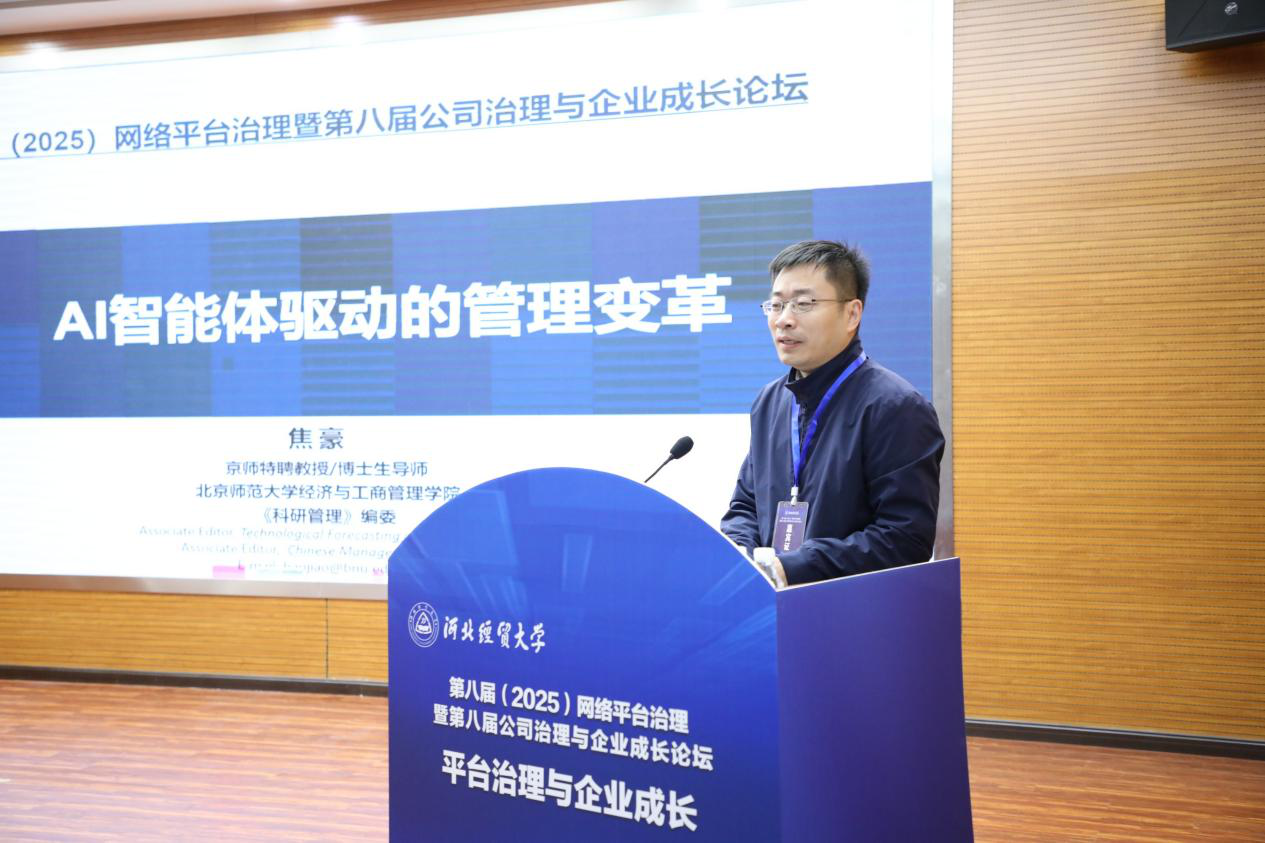 北京师范大学经济与艾弗森贝博ballbet官网焦豪教授作题为“AI智能体驱动的管理变革”的主题报告。焦豪教授首先系统分析了工业经济、数字经济、人工智能三个时代的竞争优势逻辑演变,结合平台企业案例及相关学术研究成果,阐释了AI智能体对网络效应的延伸作用及其对数字平台生态的影响。随后深入分析了AI智能体对公司治理、战略管理、组织结构、营销管理以及人力资源等企业管理各领域的具体影响,并提出了AI在企业管理中的“扎根、限定、重塑”三大应用路径。关于未来研究方向,焦豪教授提出了多元化的本土化拓展建议,包括探索“管理者-AI-员工”三方关系的新型管理逻辑、研究AI对数字初创企业商业模式的影响、分析组织与AI双向互动机制,以及解决人机协同决策中的责任界定等关键问题。