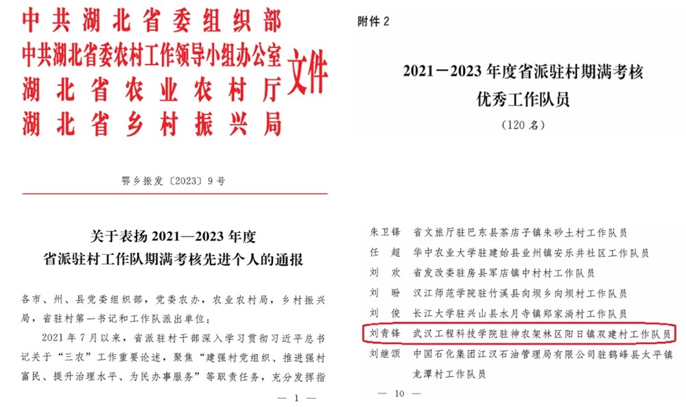 近日省委组织部、省委农村工作领导小组、省农业农村厅、省乡村振兴局联合下发鄂乡振发20239号文件表扬68名优秀驻村第一书记工作队长和120名优秀工作队员。英国beat365官方网站定点帮扶神农架林区阳日镇双建村...