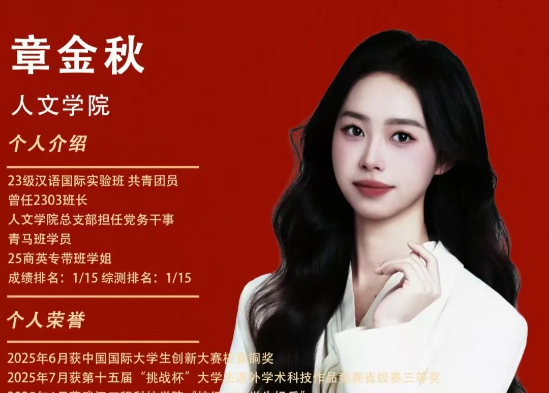 “拿到国家奖学金的那一刻,没有预想中的狂喜,更多是一种尘埃落定的踏实感。这份荣誉既是对过去一年全力以赴的肯定,更是对未来继续深耕的鞭策。”2023级汉语言文学专业的章金秋语气平静而坚定,眼中闪烁着对过往付出的笃定与对未来的憧憬。