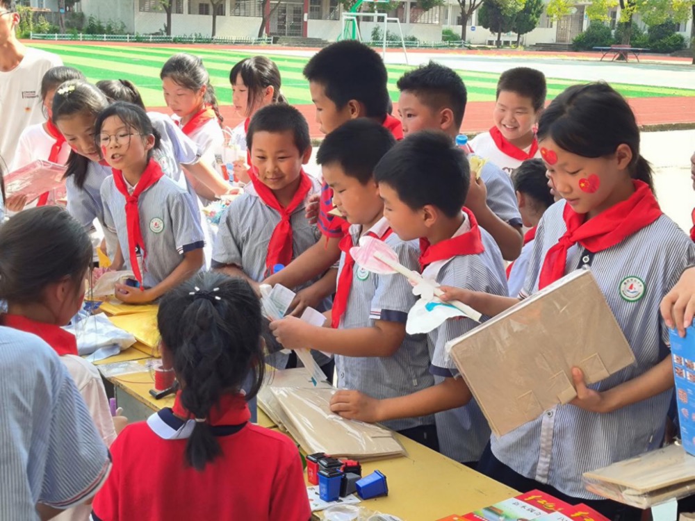 接着,孩子们用舞蹈及大合唱的方式进行文艺汇演,向关心爱护他们的支教团队的老师们表达真挚的感谢。随后,远山集市正式“开市”啦!在教学楼前,萤光之梦志愿服务团队的志愿者们为孩子们准备了大批教学物资、200本图书、大量的笔记本以及其他文具、小礼品。李美含介绍到,远山集市到今年已经开展了第四届,这些物品都是团队志愿者们利用自筹的活动资金购买的,孩子们可以用自己的手工作品兑换。小朋友们有序入场,挑选自己喜欢的物品。最后在离场的时候将自己的手工作品交给团队的志愿者。