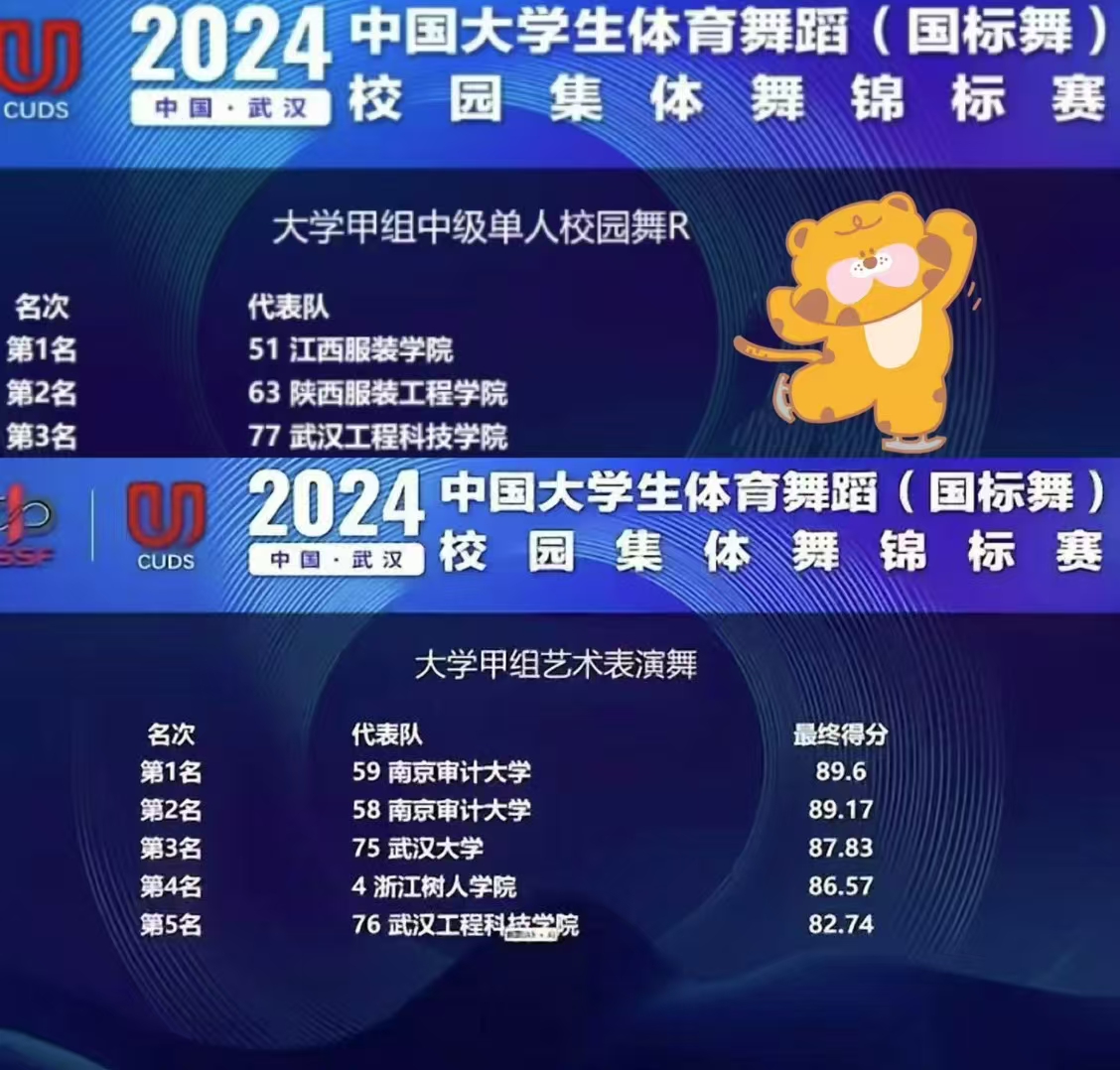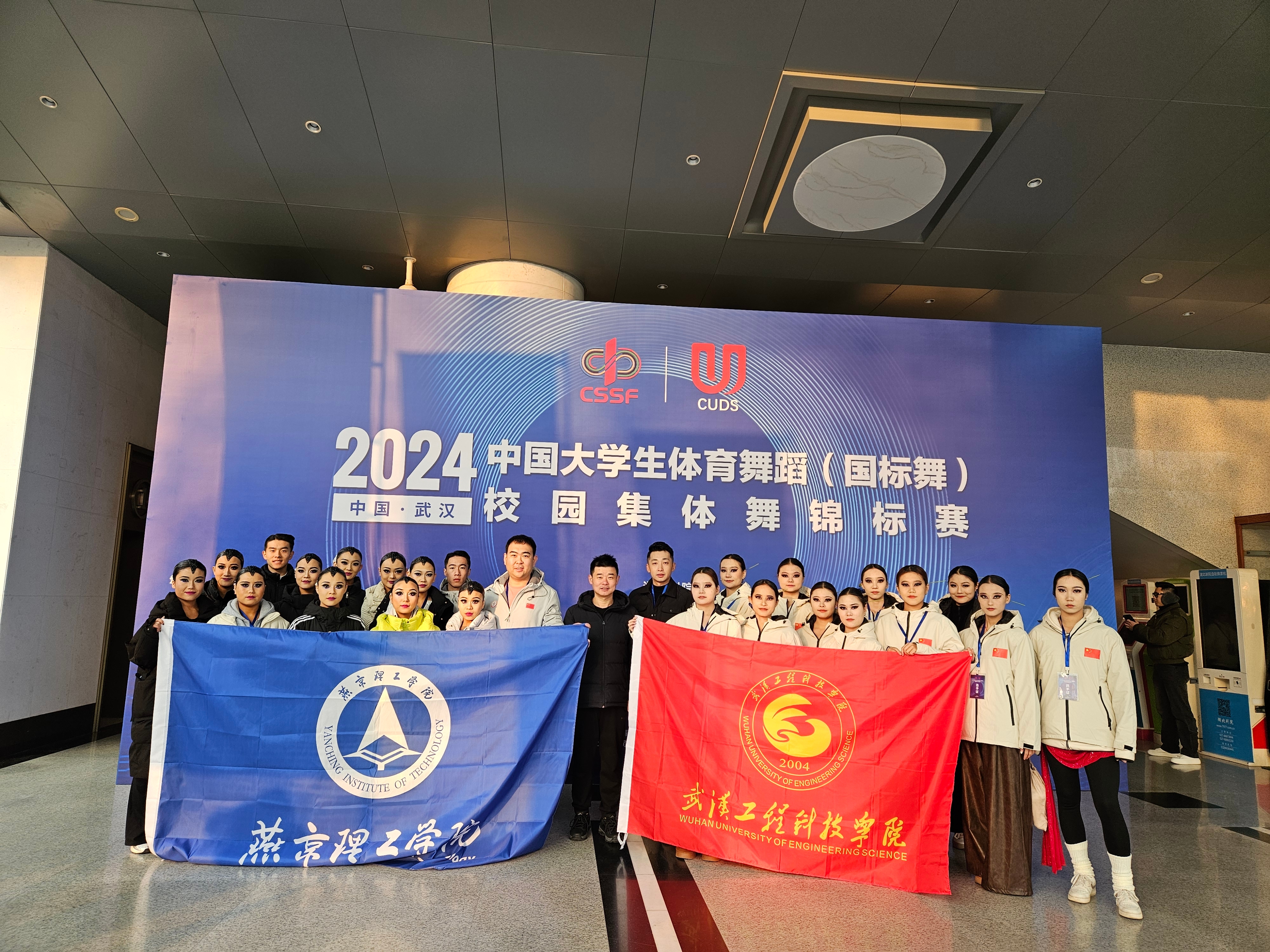 近日,2024年中国大学生体育舞蹈(国标舞)校园集体舞锦标赛在武汉·湖北大剧院顺利举办。经过激烈角逐,在领队易鹏,教练员高昆、郭声鼎三位老师的带领下,我校体育舞蹈队获得大学甲组中级第三名、大学甲组艺术表演舞第五名。
