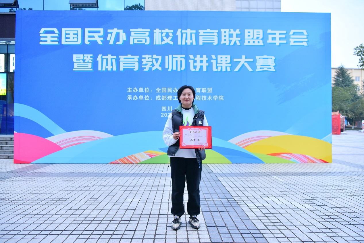 近日,全国民办高校体育联盟年会暨体育教师讲课大赛在四川乐山隆重举行。受产业学院支持,在人文学院副院长郭生鼎的带领下,我校体育系教师刘湲湲、韩雪组队参加本次比赛,经过激烈角逐,获得第二名的优异成绩。