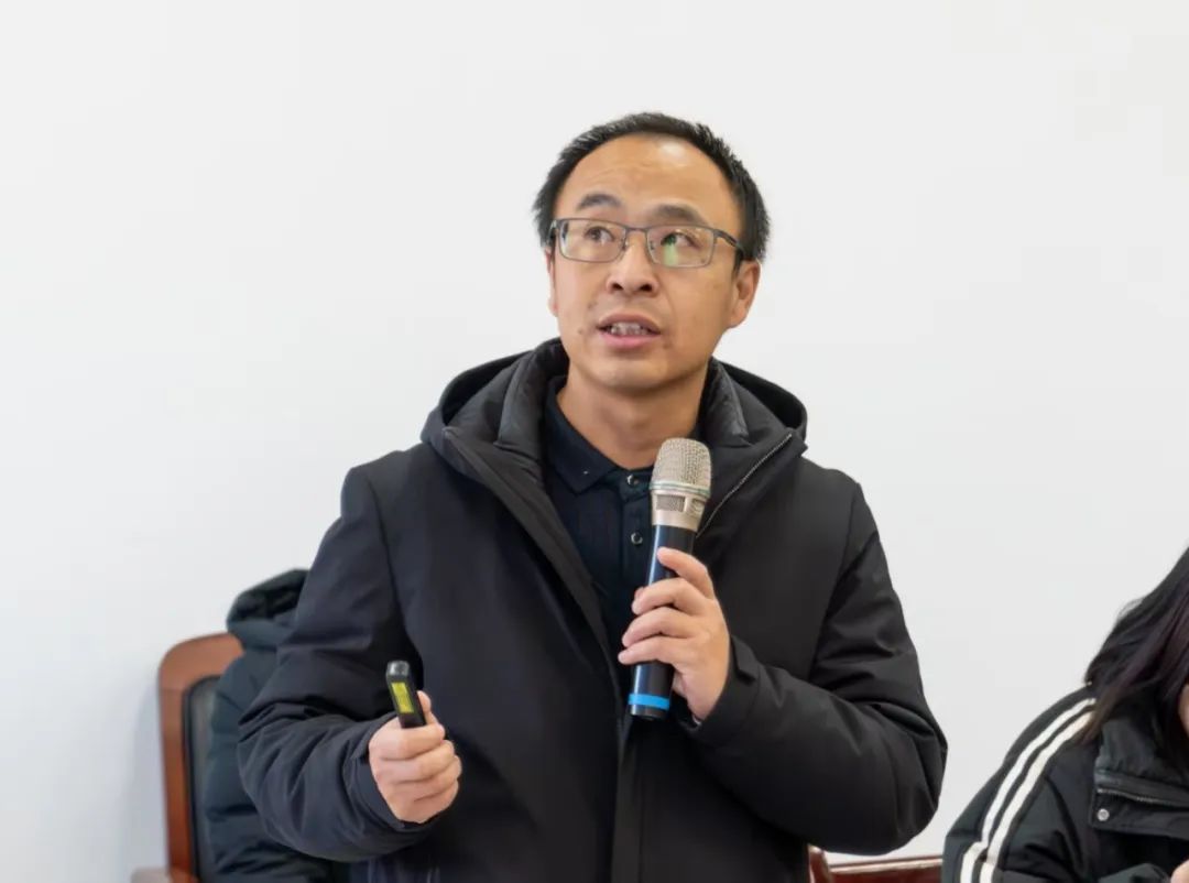 在阳谷县安乐镇农业社会化服务中心现场交流会上,镇党委副书记曹广辉为服务队讲解如何通过废弃坑塘治理、渔光互补、土地流转与租赁、党支部领办合作社等创新方式促进农业高质量发展与农户增收。