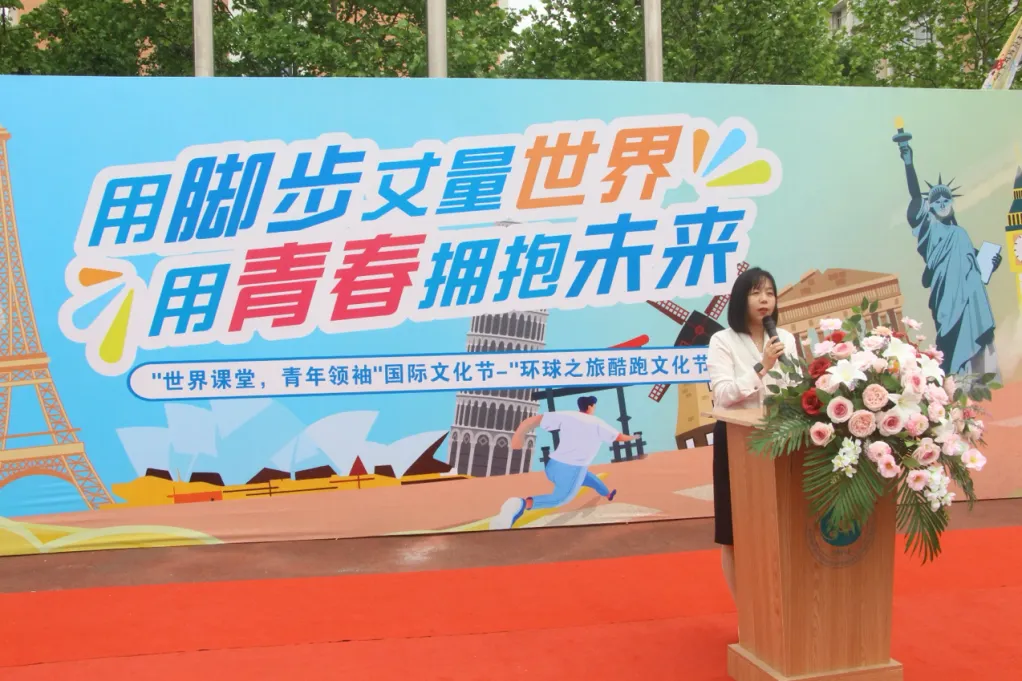 赵欢在致辞中表示学校一直以来都高度重视文化建设和国际交流,致力于为同学们打造一个开放、多元、包容的学习和成长环境,此次“环球之旅”酷跑国际文化节,更是独具匠心地将充满活力的体育运动与丰富多彩的文化体验完美融合。她希望同学们在奔跑的过程中,强健体魄,挑战极限,以独特的方式“丈量”世界,感受不同国家的文化风情。最后,她预祝本次活动取得圆满成功。