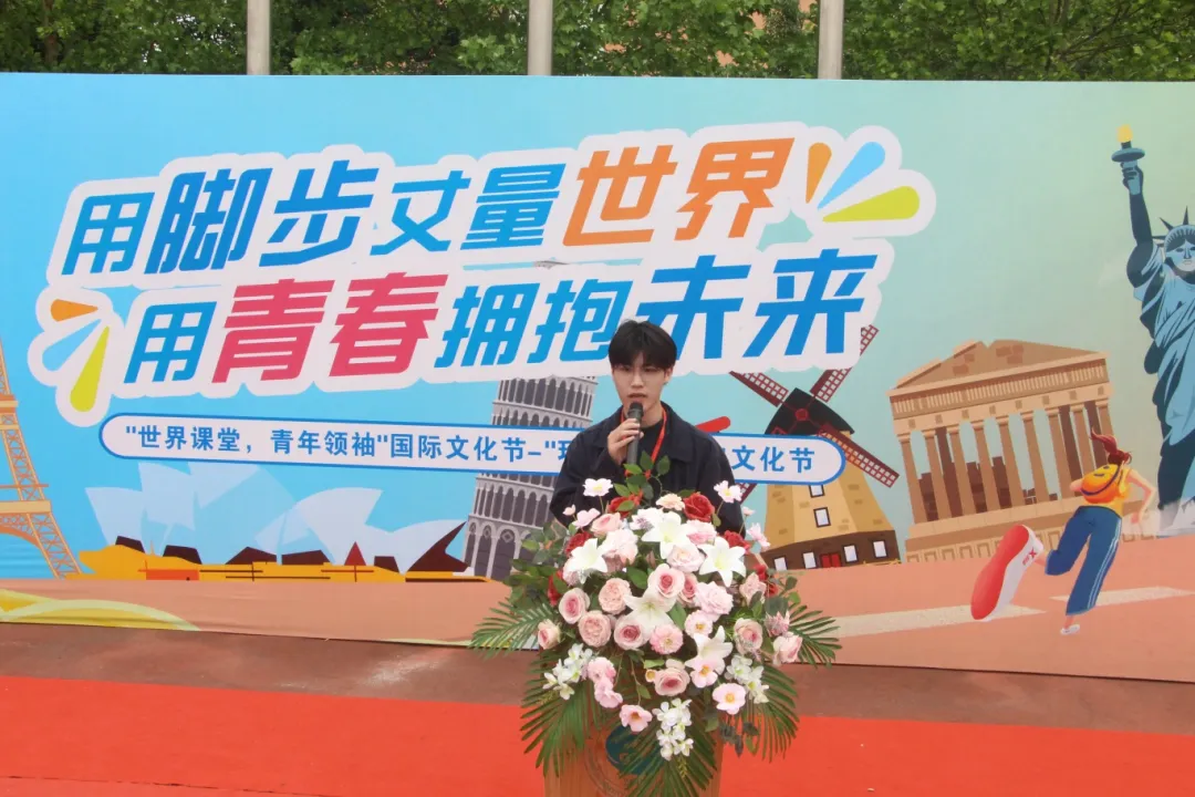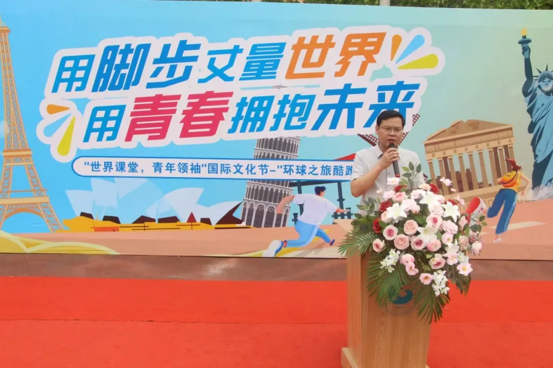 郭万春作动员讲话。他指出,国际文化节是学校丰富校园文化生活、促进国际文化交流的一次重要实践,给予了学生一个展现青春风采、拓宽国际视野的舞台。他希望,在活动中同学们能够团结协作、相互鼓励、携手共进,充分体现集体的力量。最后,他宣布本次“环球之旅”酷跑国际文化节正式开幕。