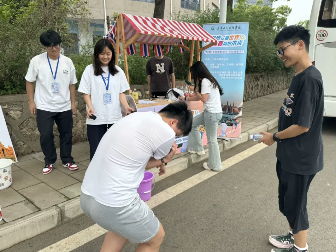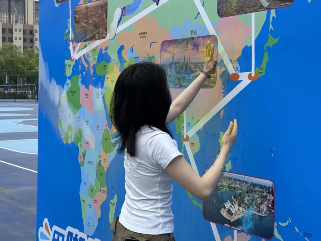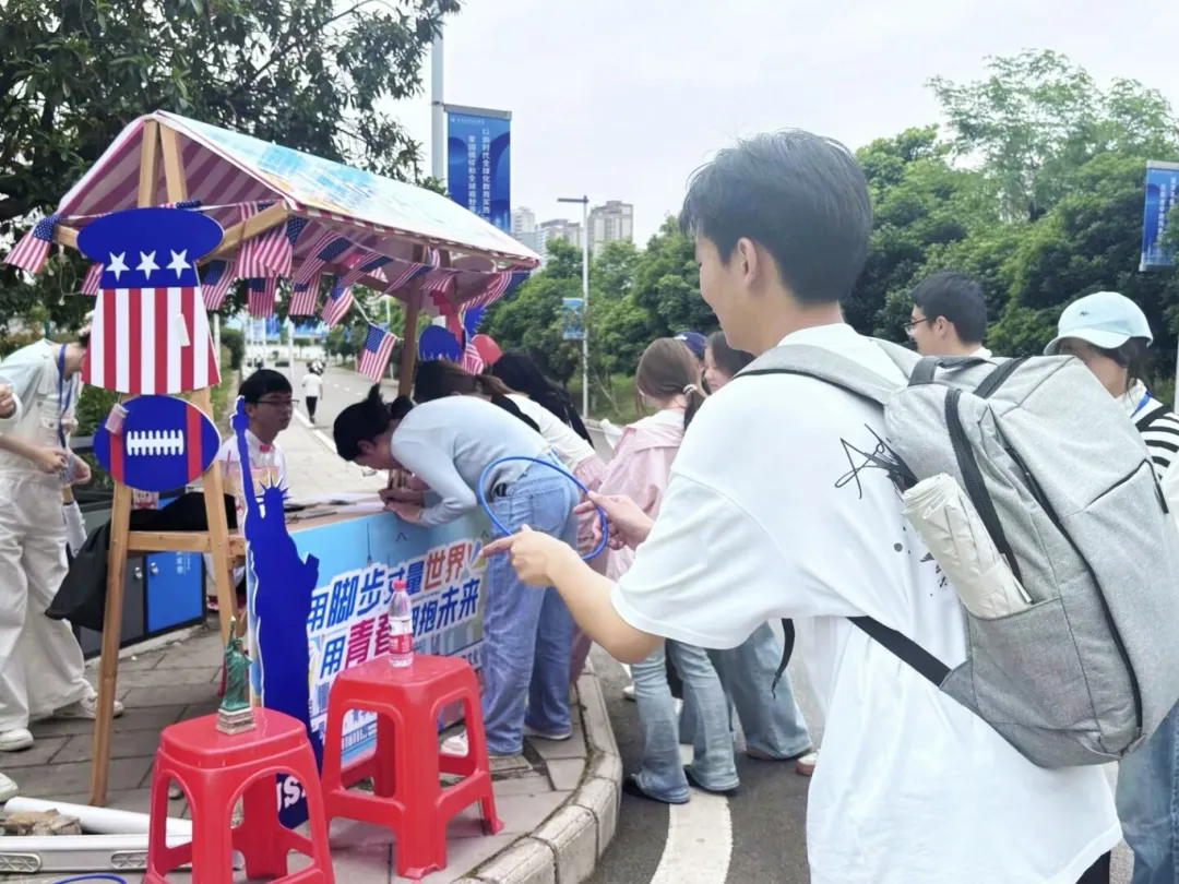 唐军国按动发令枪,标志活动正式开始。参赛选手们争先恐后穿越起跑线,纷纷奔向美国、泰国、日本、英国、澳大利亚五个目标点位,投入到紧张刺激的知识竞答和乐趣无穷的游戏中,有条不紊地进行积分打卡挑战。其中最具特色的是代表美国和泰国的游戏点位,自由女神像作为美国的标志性建筑,象征着自由和民主,“自由女神套圈乐”这一游戏参与者站在1米外,用红、白、蓝三色各色圈环套中“自由女神”的雕像。1分钟内套中2次即可通关;大象在泰国被视为力量与优雅的象征,是泰国人民的骄傲,“大象转圈泼水乐”这一游戏参与者先原地转3圈,模拟大象鼻子,然后用湿海绵投掷到目标桶内,1分钟内投中2次即过关。