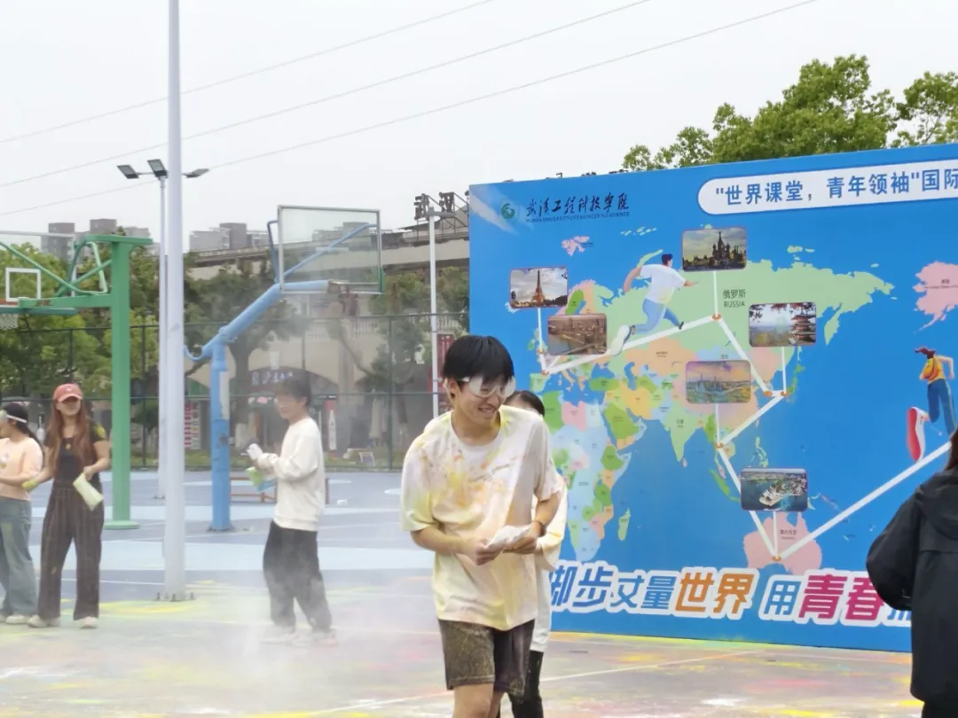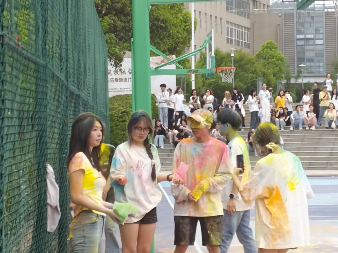 随着各个点位的活动进入尾声,参赛选手们纷纷到达终点西门篮球场。终点处为各个选手准备了彩虹粉。在他们的面前是一张巨大的世界地图,选手们纷纷将彩虹粉投掷到地图上相应的理想留学国家,以开放的心态去学习和体验不同的文化,在地图上留下美好的梦想与希望。不少选手们扬起手中的彩虹粉向彼此抛洒,在彩虹粉的“雨幕”中奔跑、欢笑、嬉戏,彼此的脸上、身上都沾满了彩色的粉末,整个场地充满了青春的气息和无尽的欢乐。