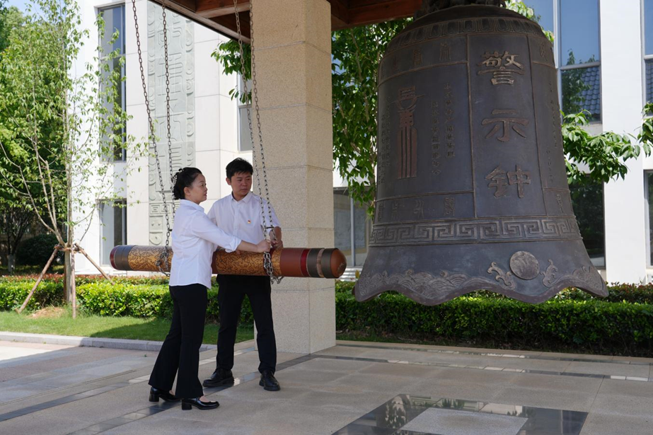在廉政文化广场,全体党员干部面向警示钟庄严肃立,学校党委书记张会利、纪委书记王加青共同敲响“警示钟”。