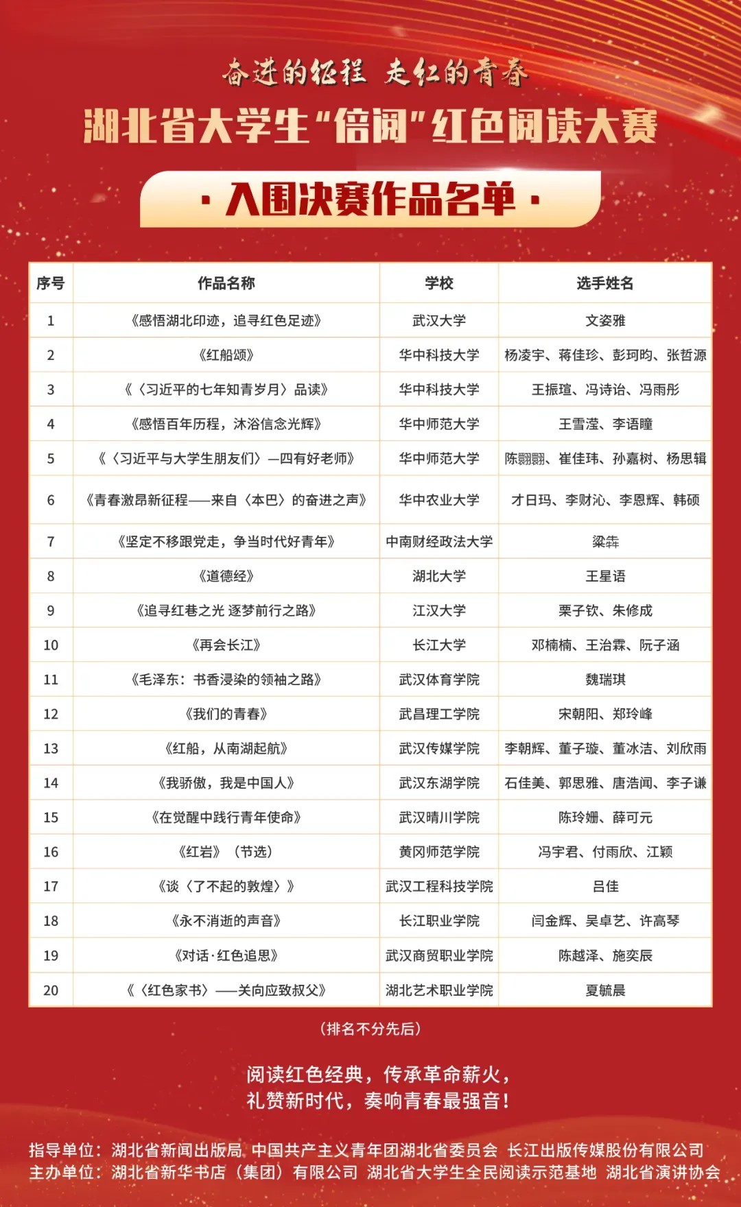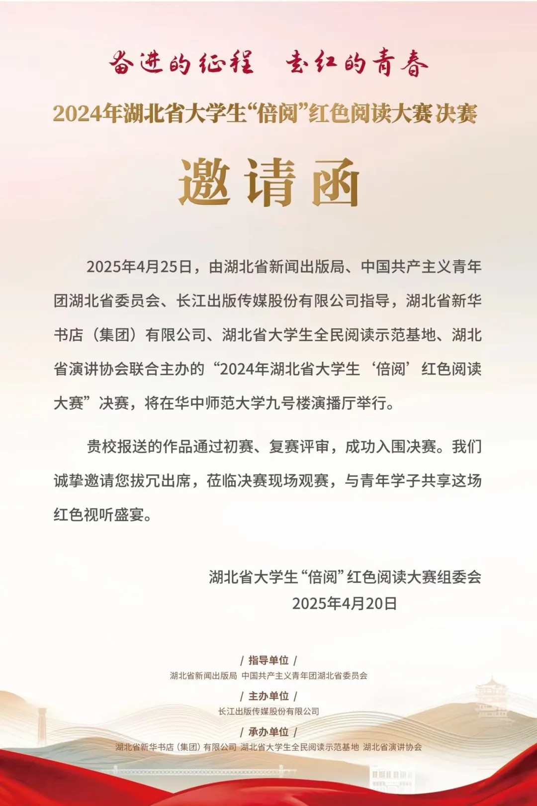 据了解,“倍阅”大学生红色共读活动,去年入选中宣部“2023-2024年度全民阅读优秀项目”。本届大赛是由湖北省新闻出版局、共青团湖北省委员会指导,长江出版传媒股份有限公司主办,湖北省新华书店(集团)有限公司、湖北省大学生全民阅读示范基地、湖北省演讲协会联合承办。