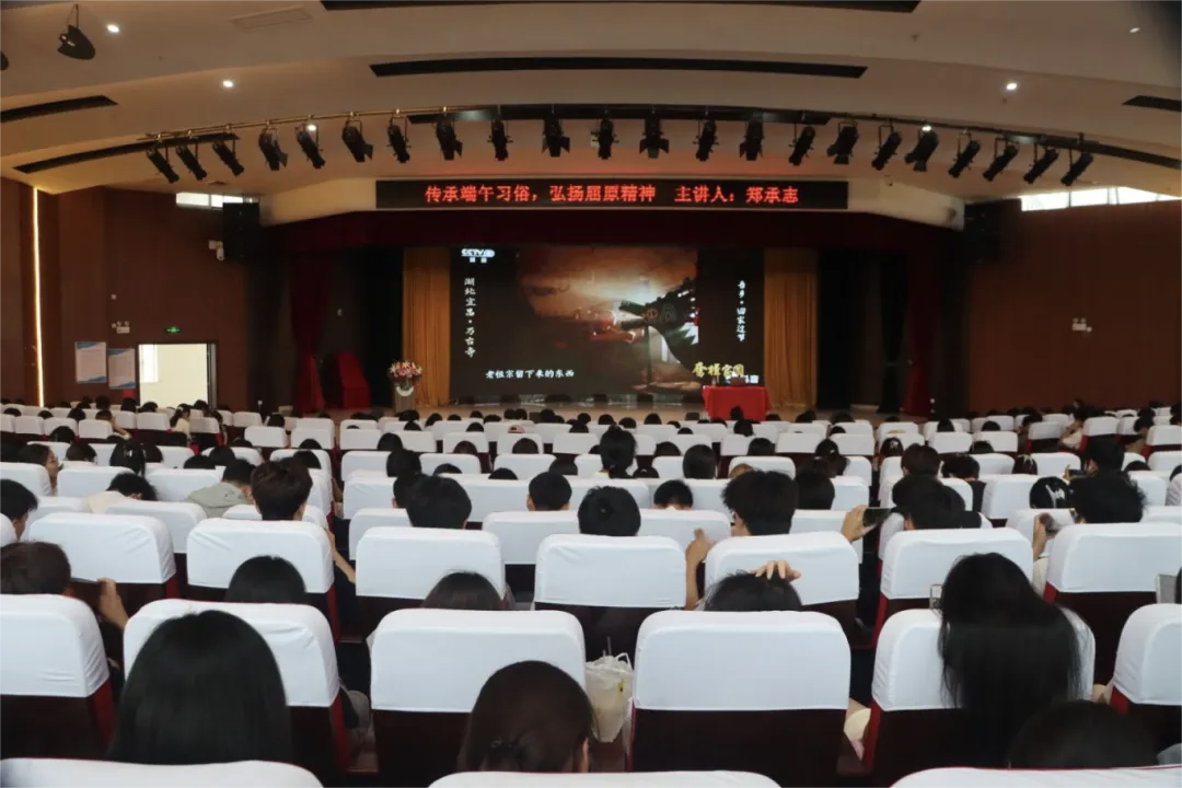 郑承志教授以“端午起源”“屈原精神”与“文化传承”为脉络展开演讲。他从历史视角解析端午节的起源,结合民间传说与文献记载,生动阐释了端午节与屈原精神的深刻联结。面对现代化对传统文化的冲击,他紧扣“不忘本来、吸收外来、面向未来”的破题思路,强调需坚守端午精神内核,同时创新传播形式,将文化传承融入地方特色与日常生活。“讲好中国故事,需以更富创意的载体传递爱国情怀。”郑承志教授呼吁青年学子以开放的视野推动端午文化走向世界,让承载中华文明的历史“龙舟”驶向更广阔的舞台。