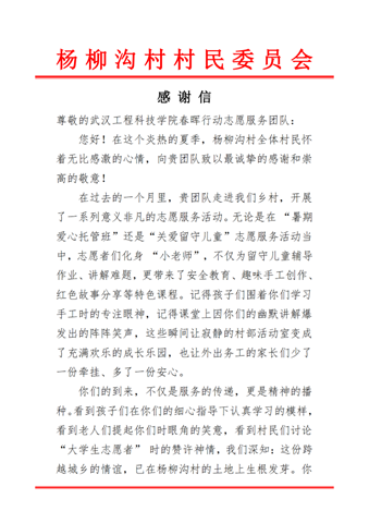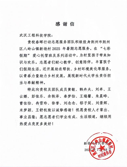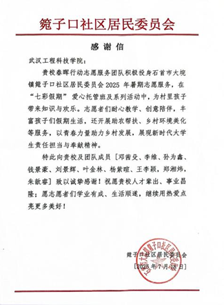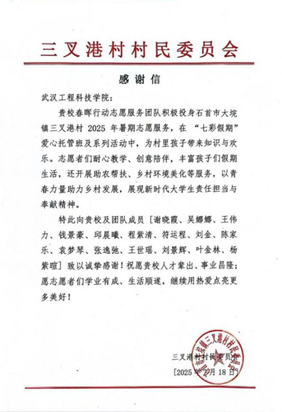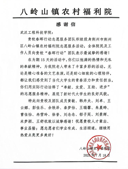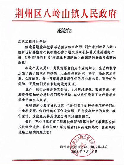 此次春晖行动团队在湖北荆州开展的暑期“三下乡”社会实践活动,不仅给当地的留守儿童和村民们带来了实实在在的帮助和关怀,也让团队成员在实践中得到了锻炼和成长。他们的辛勤付出和真心奉献,赢得了当地政府与群众的广泛认可和高度赞誉。活动期间,团队共收到来自市、镇、村各级单位的感谢信8封,以及承载着淳朴敬意的锦旗3面,还被授予石首市“志愿服务优秀团队”称号。