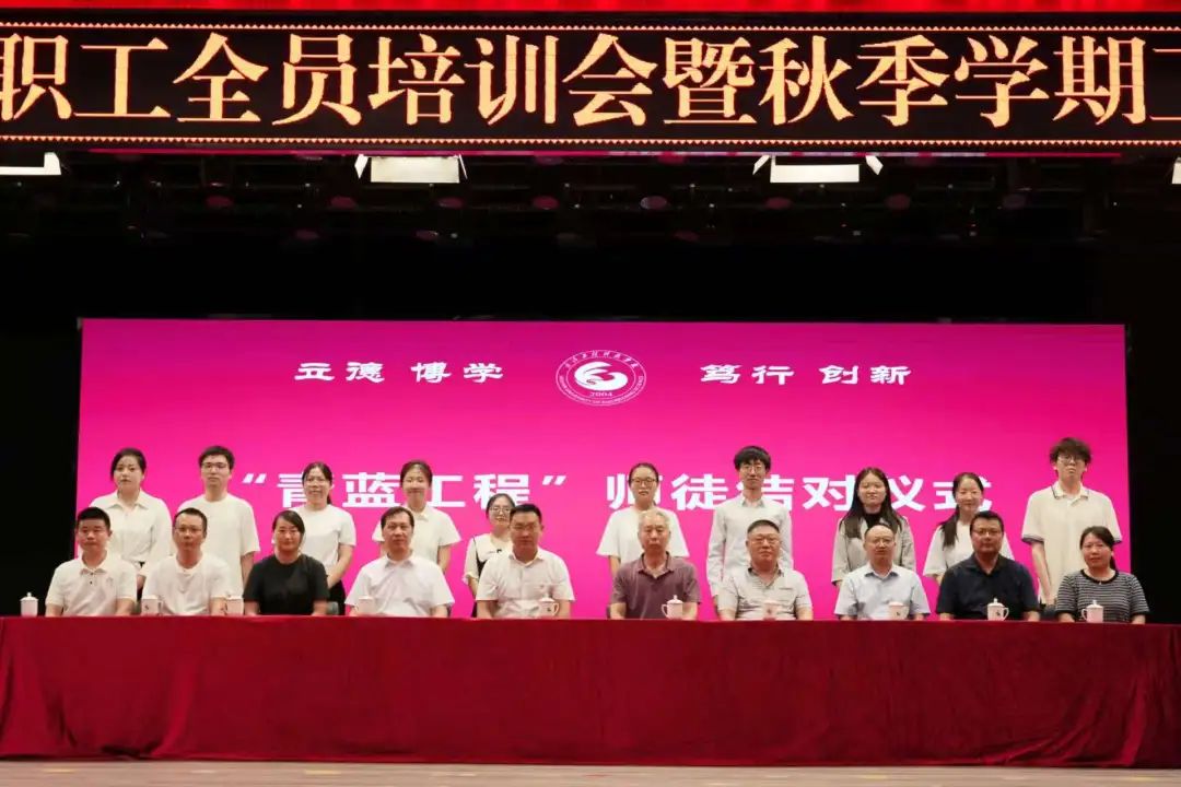 会议举行师德师风承诺书签订、新员工入职仪式、“青蓝工程”师徒结对拜师仪式等活动。活动由人事处副处长(主持工作)彭娟主持。