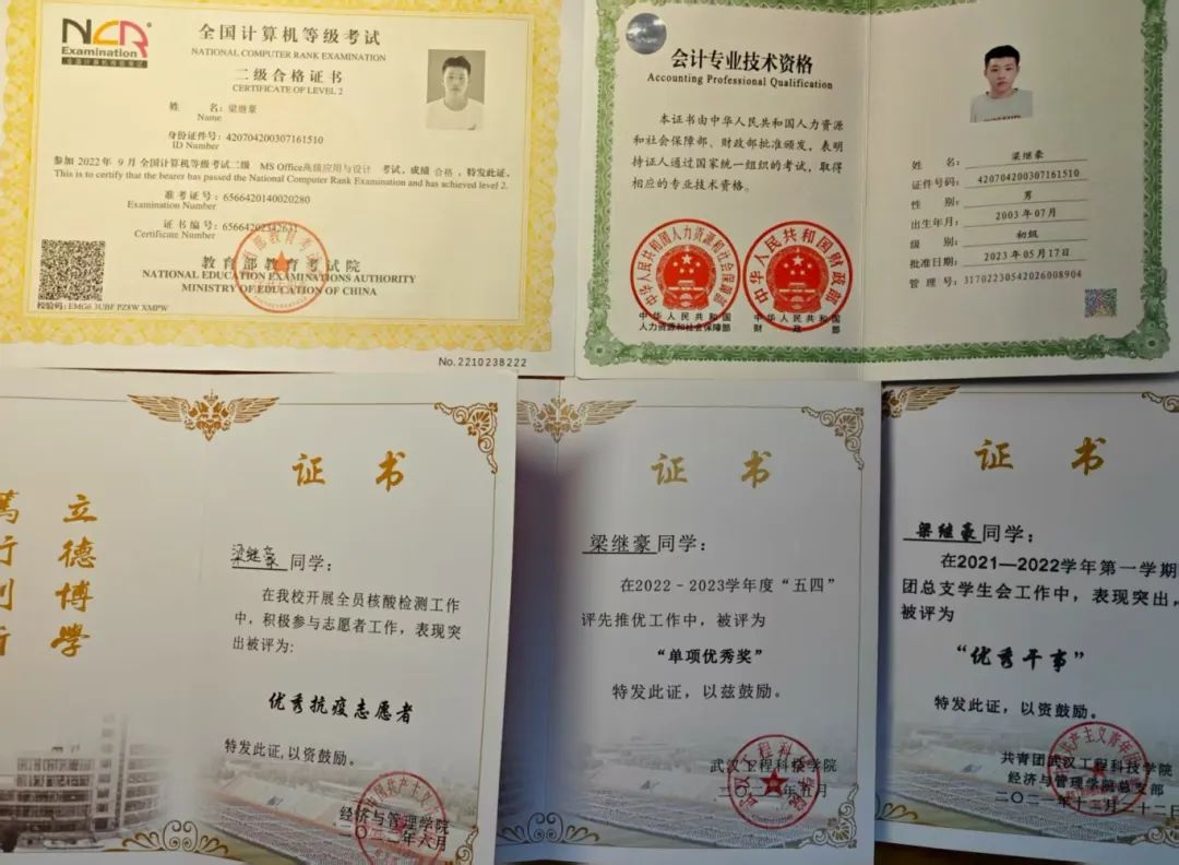 在校期间,梁继豪不仅专注于学业,还积极参与各类实习和志愿服务活动,先后荣获学生会优秀干事、五四评优单项优秀奖、优秀抗疫志愿者等多项先进个人荣誉。他曾在邮政储蓄银行参加暑期实习,在实习期间,他协助工作人员处理各项业务、整理重要文件。“那次实习经历让我深刻明白,学习不仅仅局限于课堂之上,在实践中更能锻炼一个人的沟通能力与应变能力。”梁继豪回忆道。在工作中遇到情绪激动的老年客户时,他总是会耐心地进行引导、尽自己最大的努力帮忙解决问题,始终以“将心比心”的态度对待每一位客户,多一份细心和包容。与此同时,他还凭借自己的努力考取了计算机二级证书、英语四六级证书和初级会计专业资格证书等多种专业证书。