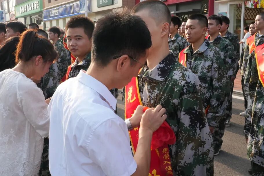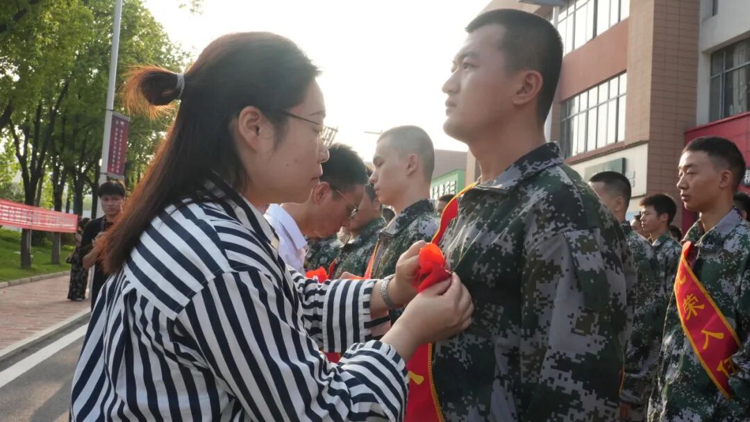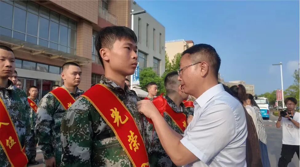 在欢送仪式上,学校领导与老兵代表共同为入伍学生佩戴大红花。