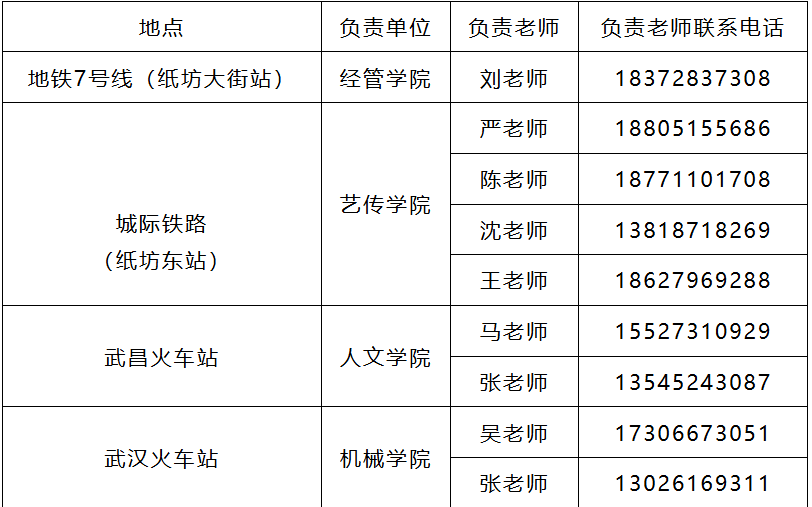 1.校外迎新交通安排停靠站点:武昌火车站、武汉站、地铁7号线(纸坊大街站F出口)、城际铁路(纸坊东站)——学校