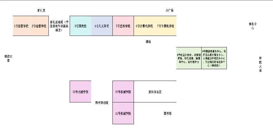 1.图书馆东侧:能量补给站、迎新指挥部、医疗救护点、绿色通道、校融媒体中心、微留学服务中心、校团委志愿者服务中心、心理健康服务中心、学业规划咨询服务中心