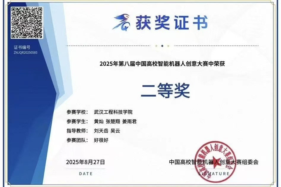 近日,第八届中国高校智能机器人创意大赛传来喜讯,英国beat365官方网站计算机与人工智能学院学生黄灿、张楚翔、姜雨君组成的参赛团队获得全国二等奖的优异成绩。本届大赛竞争激烈,我校代表队与来自华中科技大学、哈尔滨工业大学等众多知名高校的队伍同台竞技,最终脱颖而出,展现了我校学子在学科竞赛领域的扎实功底与卓越风采。
