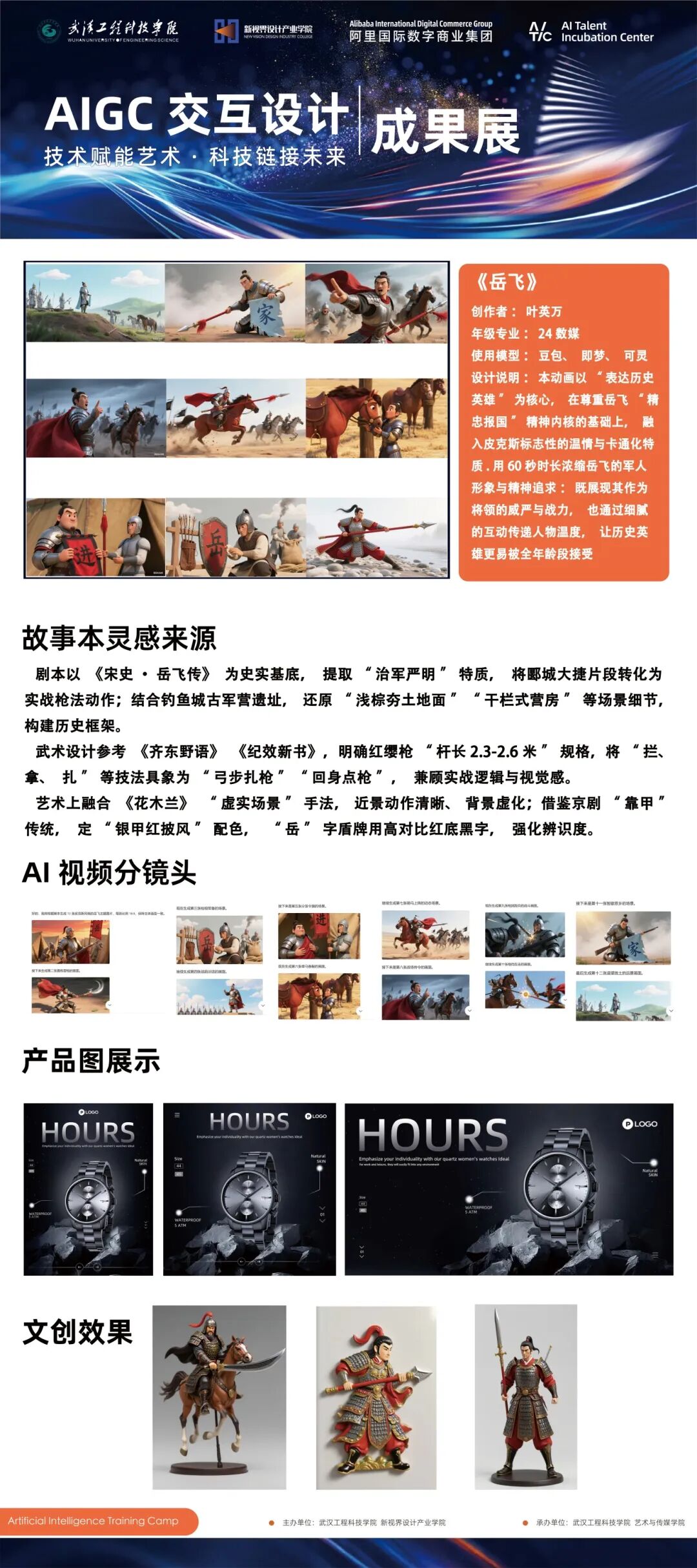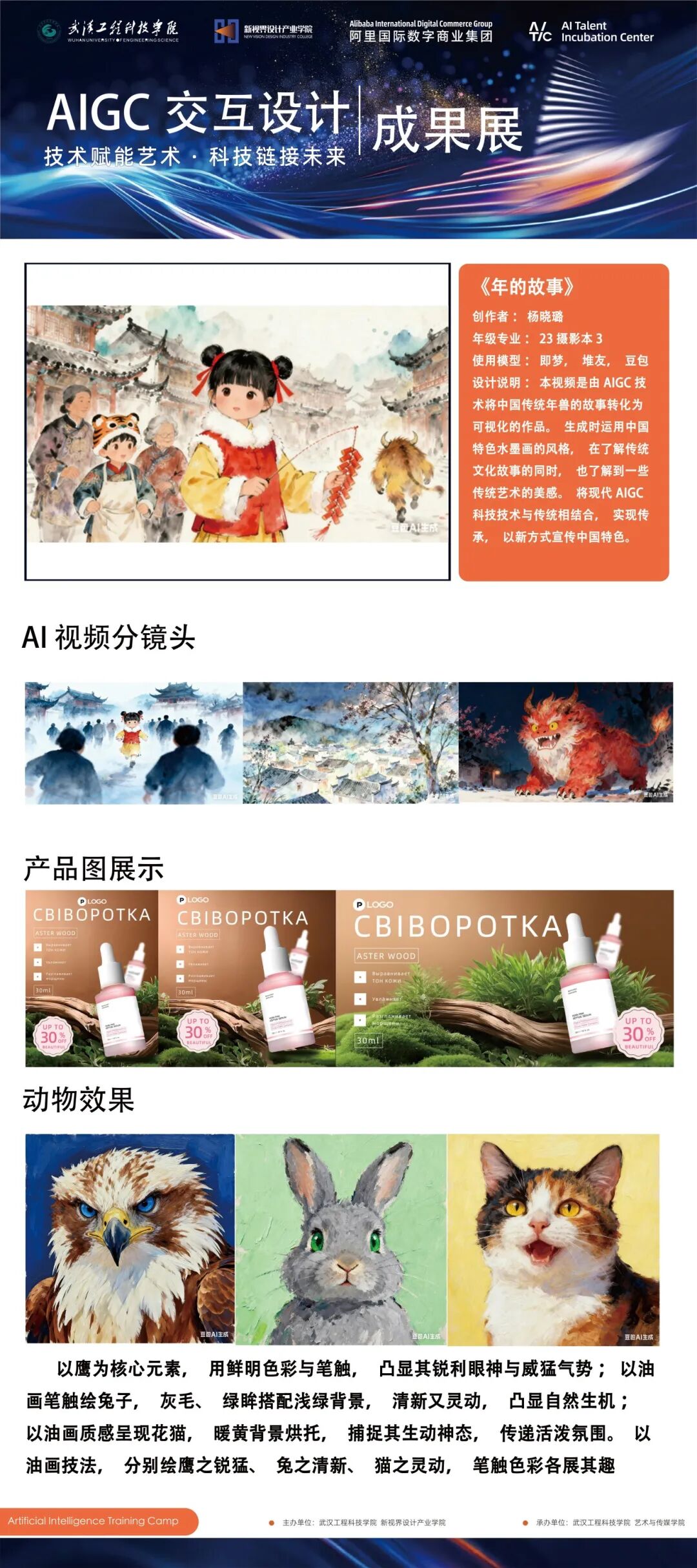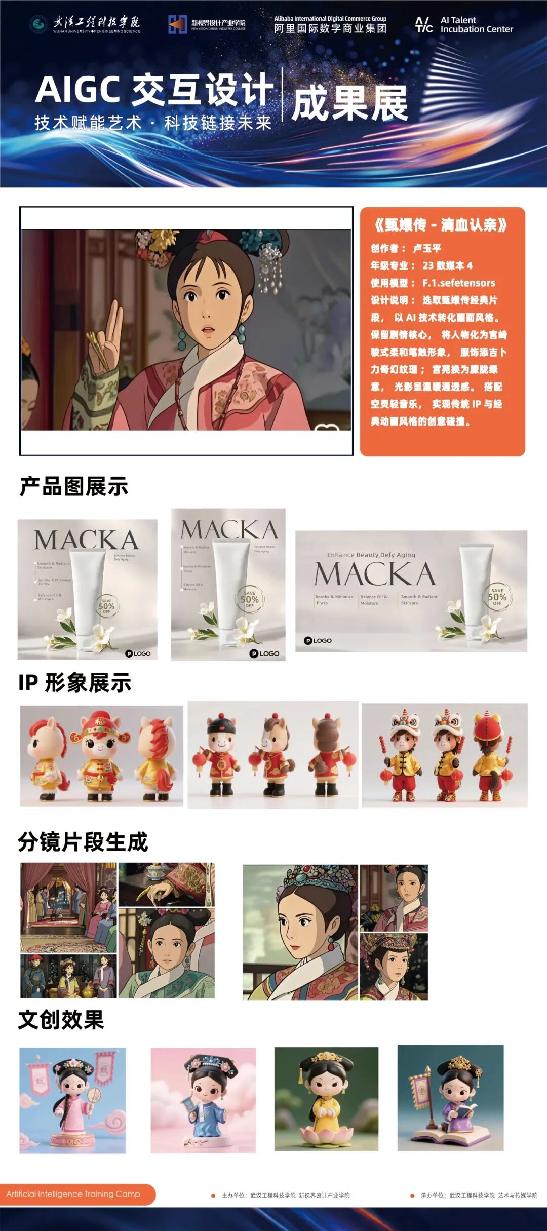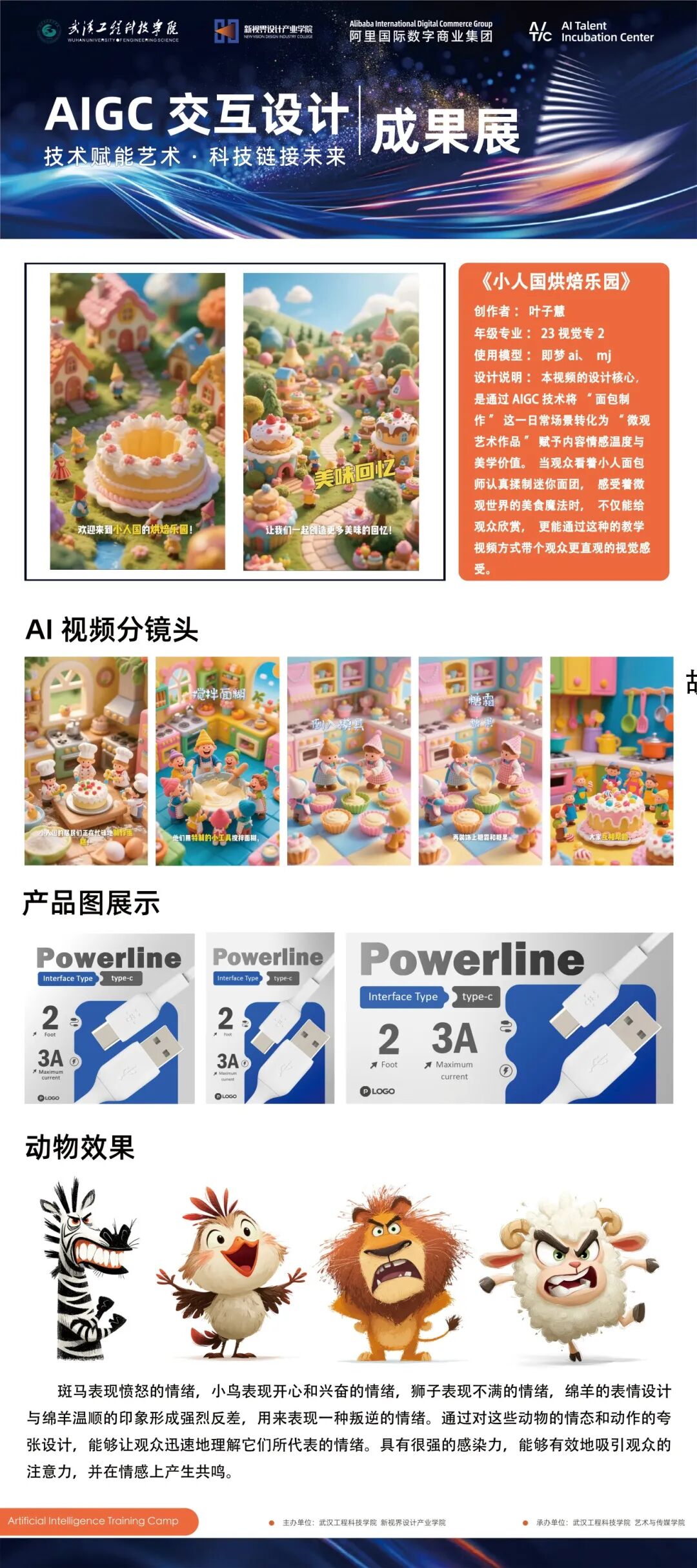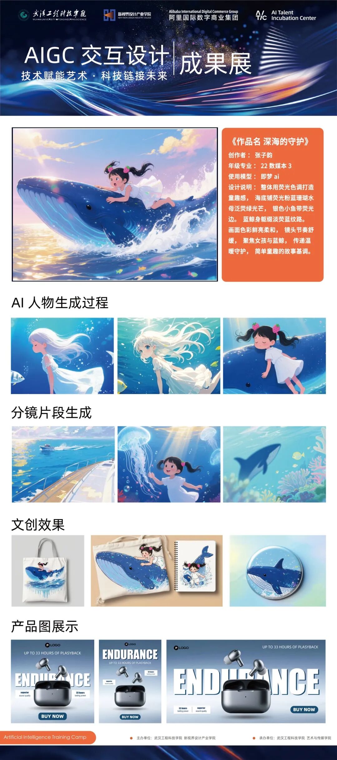 工作坊以AIGC技术为核心,聚焦文化创意产业数字化转型趋势,融合了峰会研讨、工具实训与命题实战三大模块。参与学生通过系统学习AI前沿工具,并结合版权合规课程,完成了从技术学习到作品孵化的全流程实践。