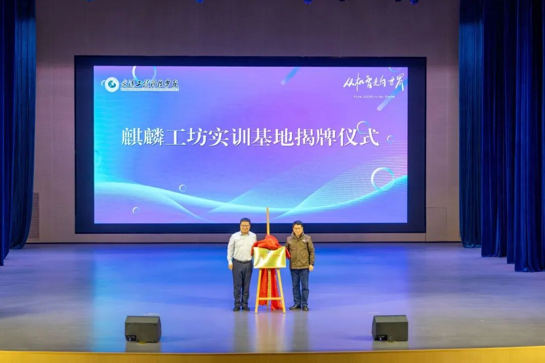 在全场热烈的掌声中,杭斯乔与蔡之华共同登台,为麒麟工坊实训基地揭牌。