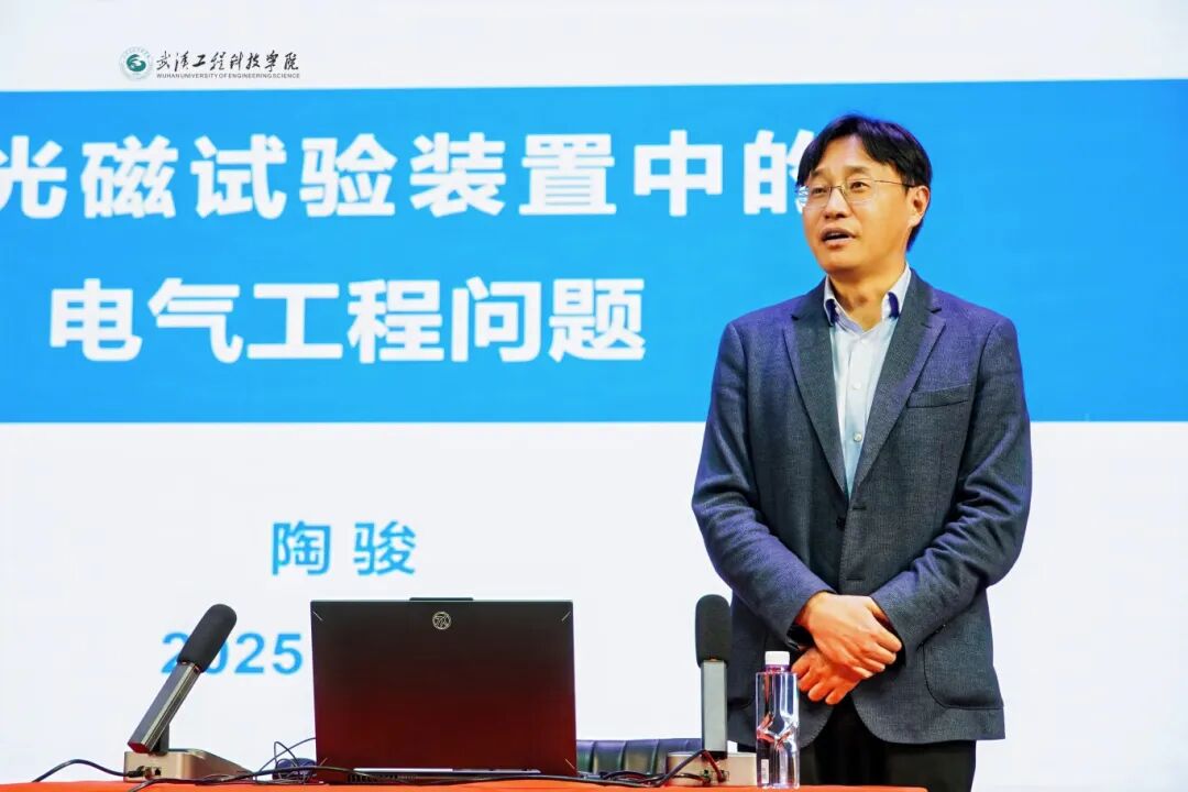 安徽大学电气工程与自动化学院院长陶骏教授作题为《强光磁试验装置中的电气工程问题》的主题报告。