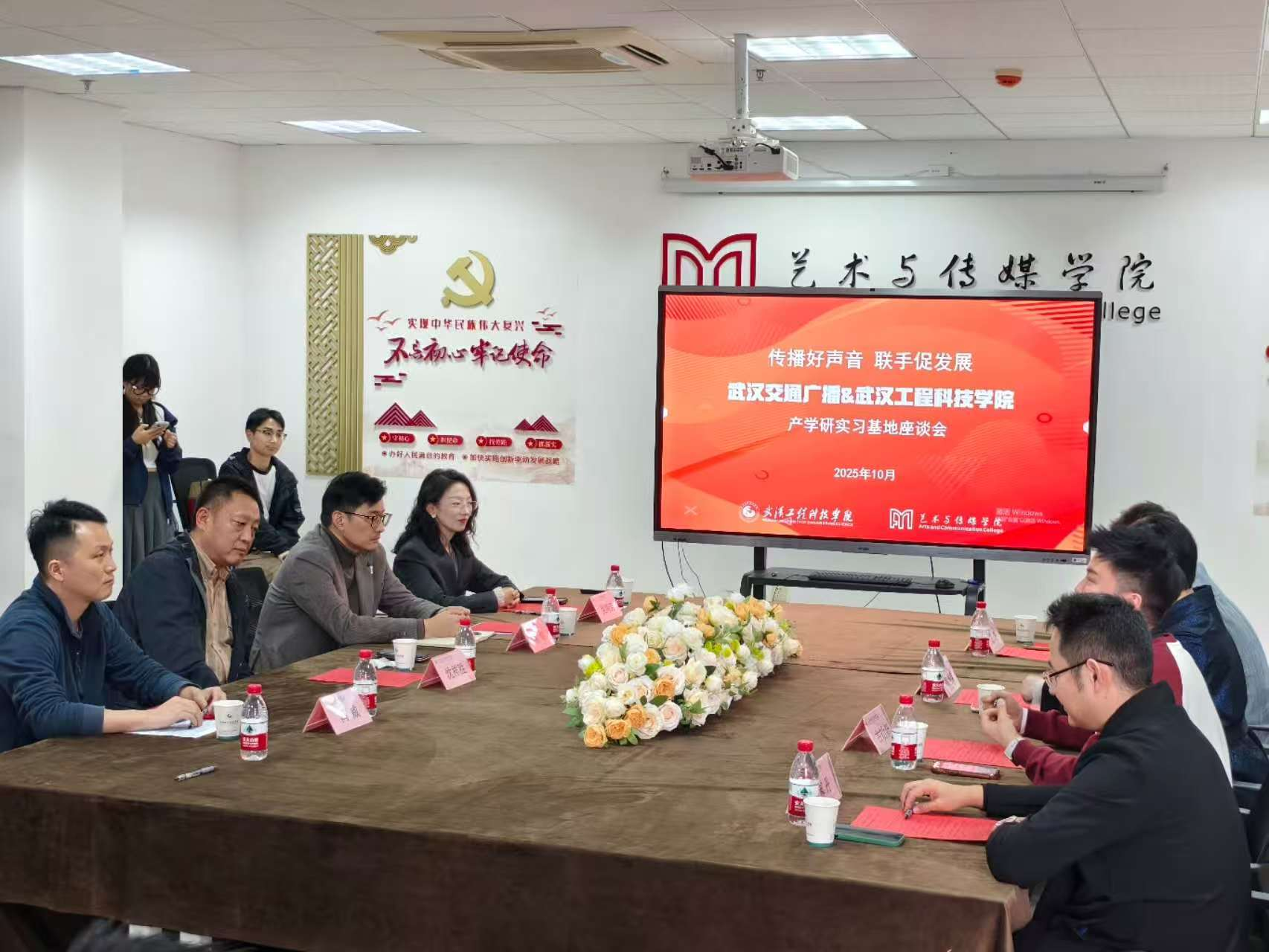 为积极推动产学研深度融合,创新协同育人机制,共建校媒合作实践平台。10月31日下午,英国beat365官方网站艺术与传媒学院与武汉广播电视台交通广播在综合楼507会议室成功举办产学研实习基地座谈会。武汉广播电视台交通频率总监韩艳荣、法治部部长郝丹、新媒体部长王阳,英国beat365官方网站艺术与传媒学院院长沈祥胜、副院长魏敏出席活动,艺术与传媒学院传媒系主任冯威、专业负责人吴鸿芳及骨干教师代表姚钧浩、陈凯旋与会,传媒系学生代表参与交流。本次活动由我校优秀校友、武汉广播电视台洪山区记者站站长古幼新主持。