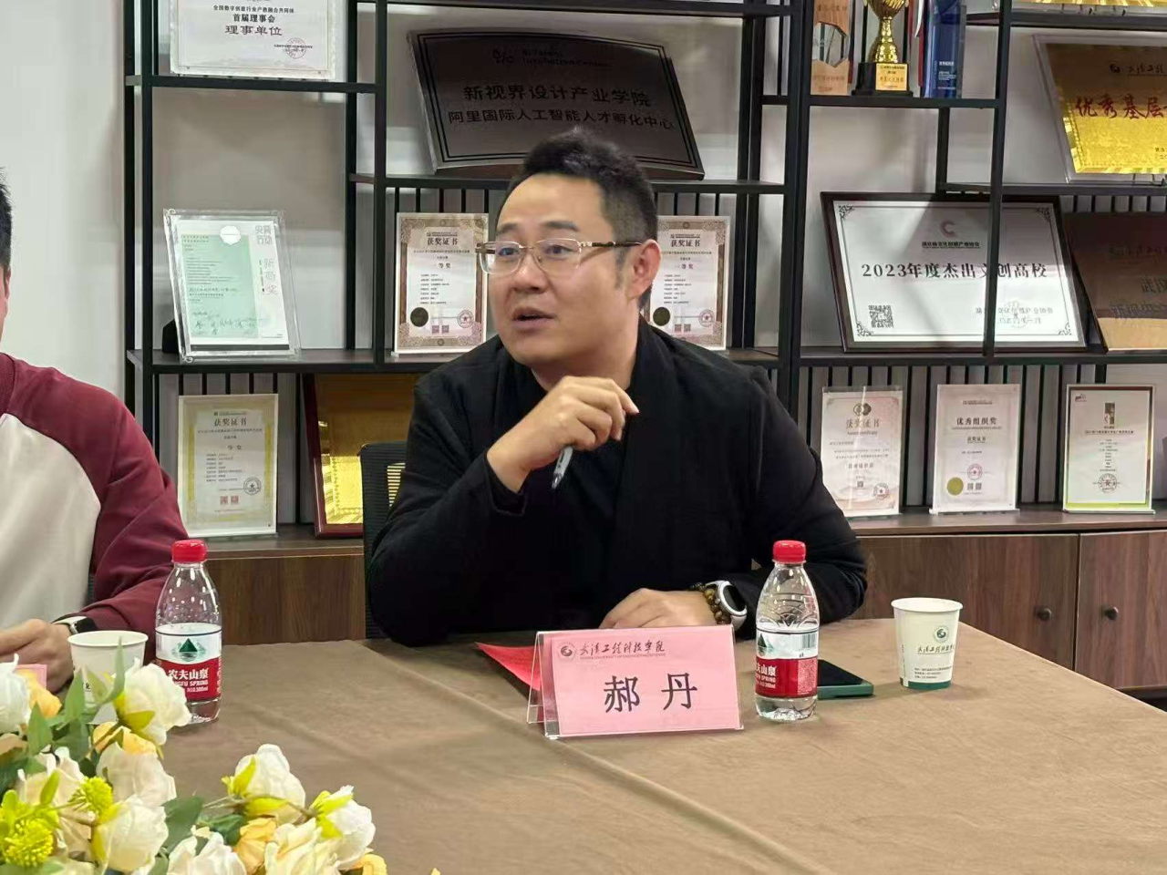 会议伊始,沈祥胜在致辞中首先对武汉广播电视台交通广播各位嘉宾的到来表示热烈欢迎,并指出深化校媒合作、推进产教融合对人才培养至关重要。他系统阐述了学院以"媒介融合"为核心的办学特色,指出学院由设计与传媒两大专业群构成,设计学聚焦"视觉传播",深耕信息可视化与声音媒体等新媒体形态;传媒类专业专注内容挖掘与生产,共同构建多学科融合体系。他强调期待通过与行业深度合作,将前沿实践融入课程建设,共同推进校媒合作迈向实质阶段,打造与行业紧密接轨的办学特色。