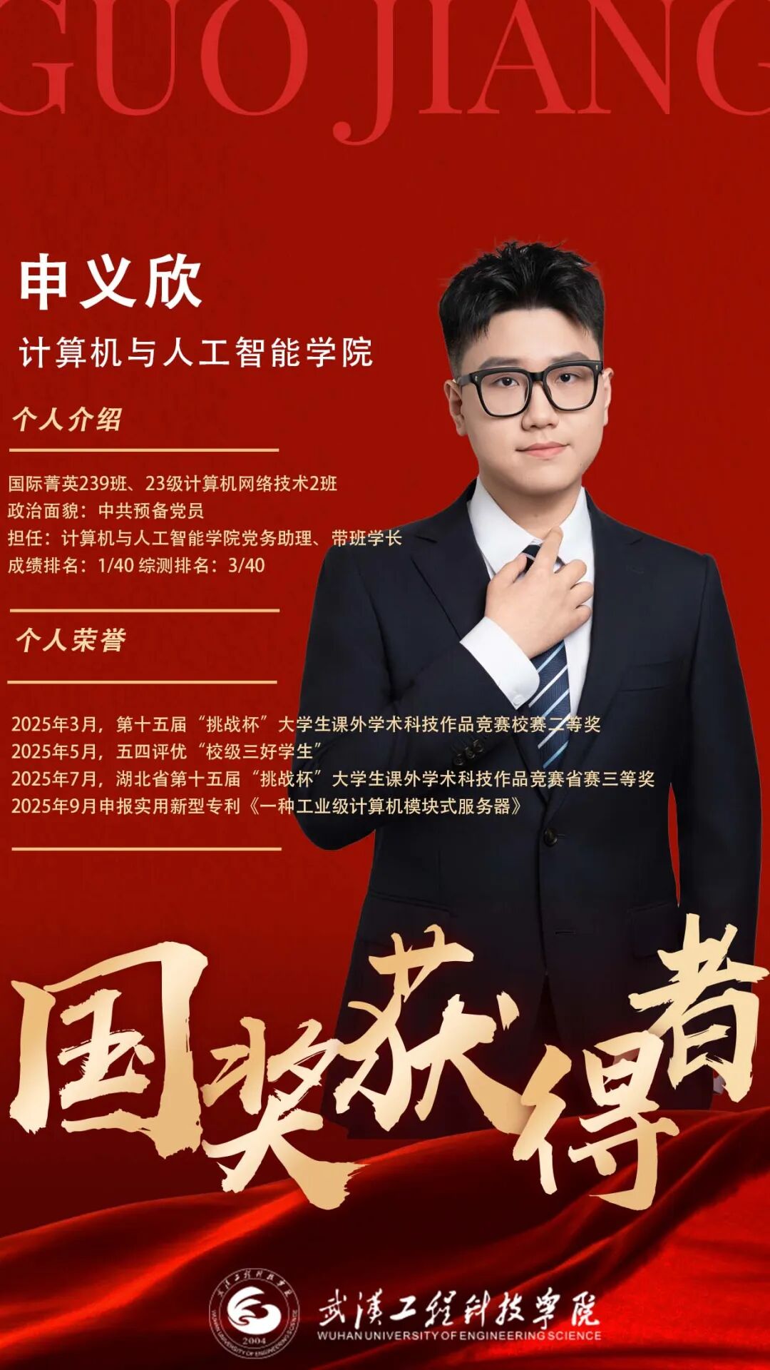努力,是给自己最好的交代。自入学以来申义欣保持着积极进取的心态,无论是在日常的学习生活还是实践活动,他都全力以赴。他在学业成绩上做到专业第一,综测成绩上做到专业第三,并申报了实用新型专利。学习之余他积极参加竞赛,收获湖北省“挑战杯”大学生课外学术科技作品竞赛省赛三等奖、“校级三好学生”等省级、校级荣誉8项。
