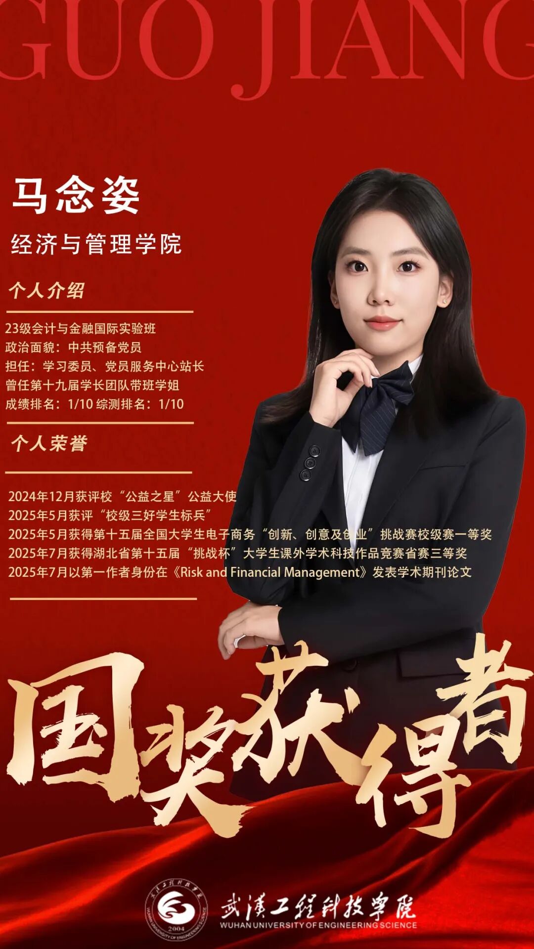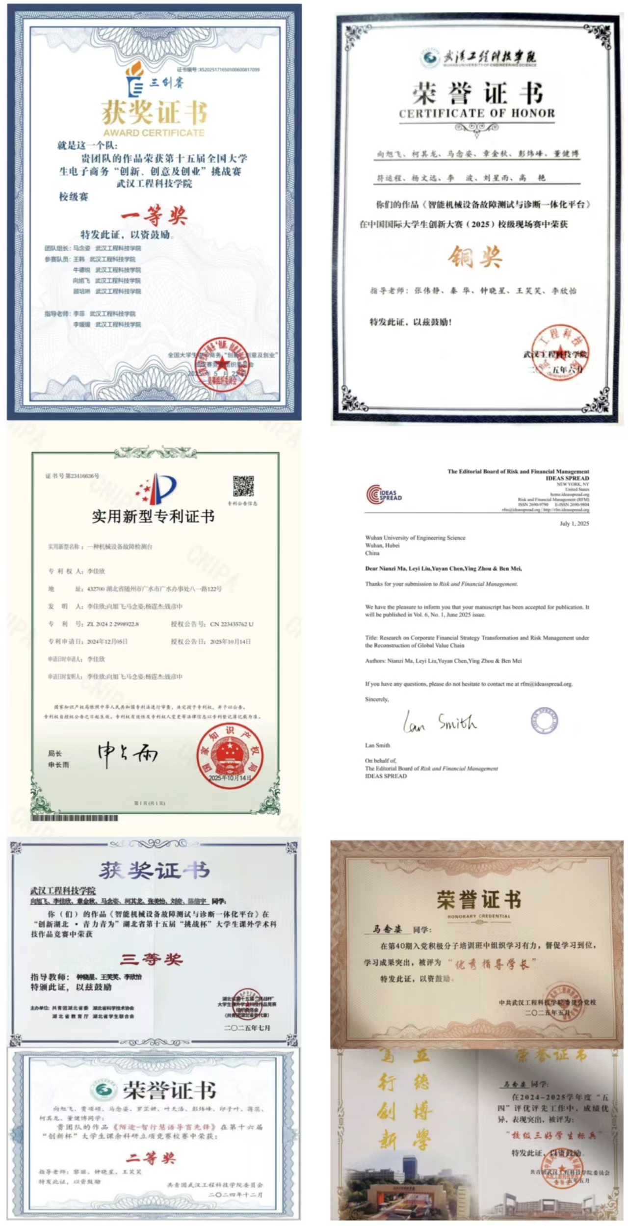 知不足而奋进,望远山而前行。马念姿在大学里积极参加各类比赛,把期待藏进每一次准备里,把勇气化作报名的行动力,“竞赛于我而言,是‘以赛促学'的成长契机。我会在比赛中锻炼自己的逻辑思维能力,把课本里的理论知识转化为可落地的实操方案。”时光不负有心人,她凭借着自身努力一次又一次的证明了自己,获评了“校级三好学生标兵”、第十五届全国大学生电子商务“创新、创意及创业”挑战赛校级赛一等奖、湖北省第十五届“挑战杯”大学生课外学术科技作品竞赛省赛三等奖,并以第一作者身份在《Risk and Financial Management》发表学术期刊论文。
