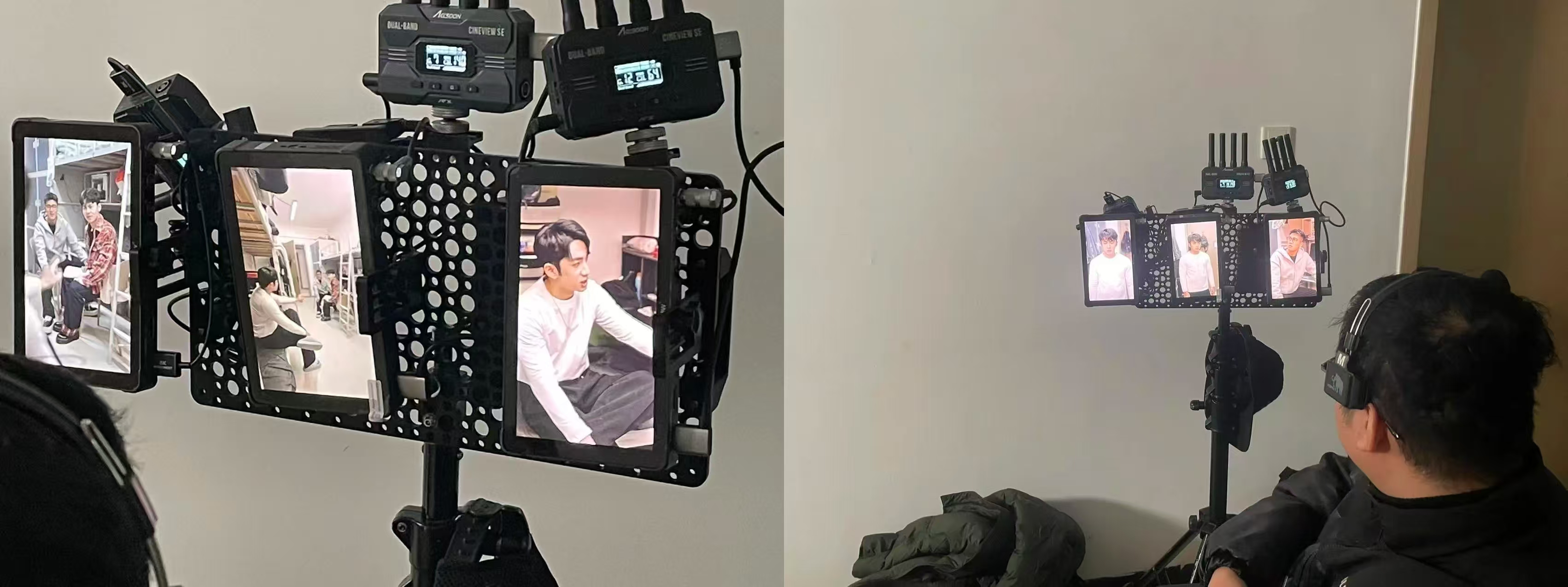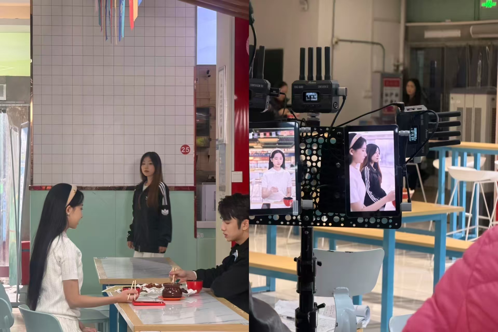 “Action!”的指令,不再局限于黑匣子剧场。在校期间所拍摄的时间长达两日,拍摄剧组所在的图书馆五区报告厅正在进行着剧本里青春校园剧情的拍摄,角落里架起监视器,艺传表演系参演的多名学生正依据脚本进度走戏、提前熟悉演员调度。