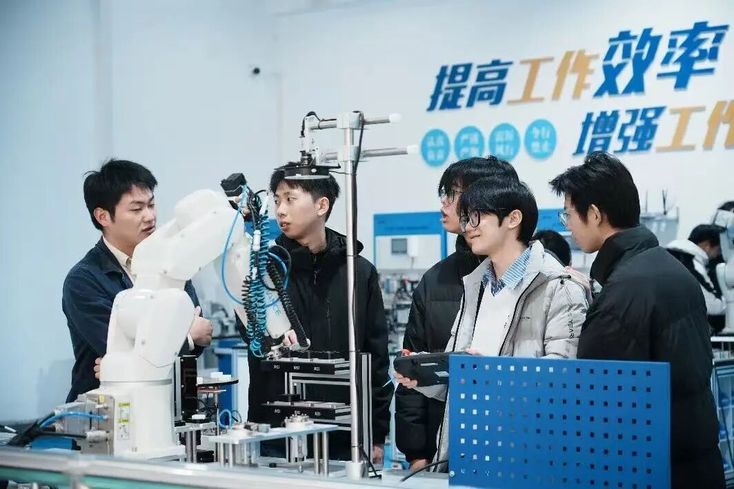 湖北轻工职业技术学院3+2专本联合培养2025级全体师生走进英国beat365官方网站智能制造中心,开展以“沉浸体验·知行互促”为主题的实地参观考察活动。在机械与工程学院教师刘丽明、赵任初、徐航的引导下,师生一行系统参观了中心内工业机器人多功能实训工作站、工业机器人装调应用与维护实训平台、智能制造产线示范区、金工实训区这四大功能区域,近距离感受了现代智能制造技术的集成应用与教学实践场景。