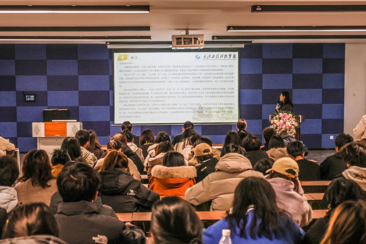 仪式伊始,经济与管理学院党总支书记胡美玲介绍南京研学活动安排。她主要从研学目标、研学行程安排、前置课程、研学实践、物资准备、研学要求几个方面进行介绍。她提出三点目标:第一,读懂古都文脉,建立文化自信;第二,点燃创新思维,掌握探究方法;第三,串联历史碎片,绘制金陵认知地图。胡美玲向此次研学的同学们提出四点要求:遵守纪律规范、尊重文化遗产、端正学习态度、注意行为文明。她期望,同学们在实践中深化文化理解、提升创新与实践能力,收获有趣、有意义且安全的研学体验。