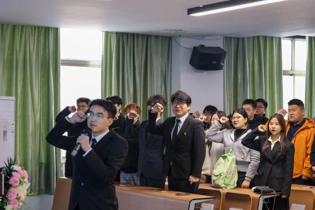 仪式进入宣誓环节。由计算机与人工智能学院信息安全技术应用专业的田庚领誓,全体研学同学起立,集体宣誓。