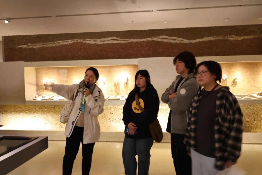 饱含着从车站月台收获的历史余温,研学团随后走进了南京历史的另一座文化殿堂——南京博物院。在南京博物馆的历史馆内,新石器时代的玉琮引发同学们对上古祭祀的讨论;西汉时期的金兽让大家直观感受到古代工匠的非凡智慧。通过讲解员的深入阐释,冰冷的文物也被赋予历史的温度与思想的深度,学子们的讨论也从惊叹,延伸至对古代信仰体系、社会结构的探究。步入民国馆,复原的老街景、电车与商铺,将书本上的时代风云转化为可触摸的生活场景,许多同学在此驻足欣赏。这场从具体文物到生活场景的沉浸式参观,让同学们真切体会到文明在层叠与交融中的演进。