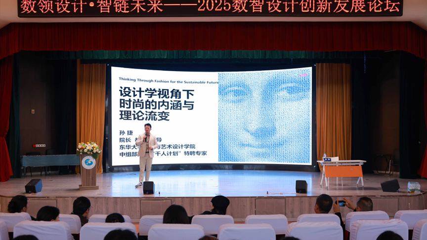 在主题演讲环节,孙捷教授以《设计学视角下数字时尚发展与逻辑》为题,从全球视野出发,系统阐释了数字时尚不仅是技术的应用,更是设计逻辑、文化价值与产业生态的系统性重构。他强调“设计驱动式”社会创新在可持续消费与产业升级中的核心作用。
