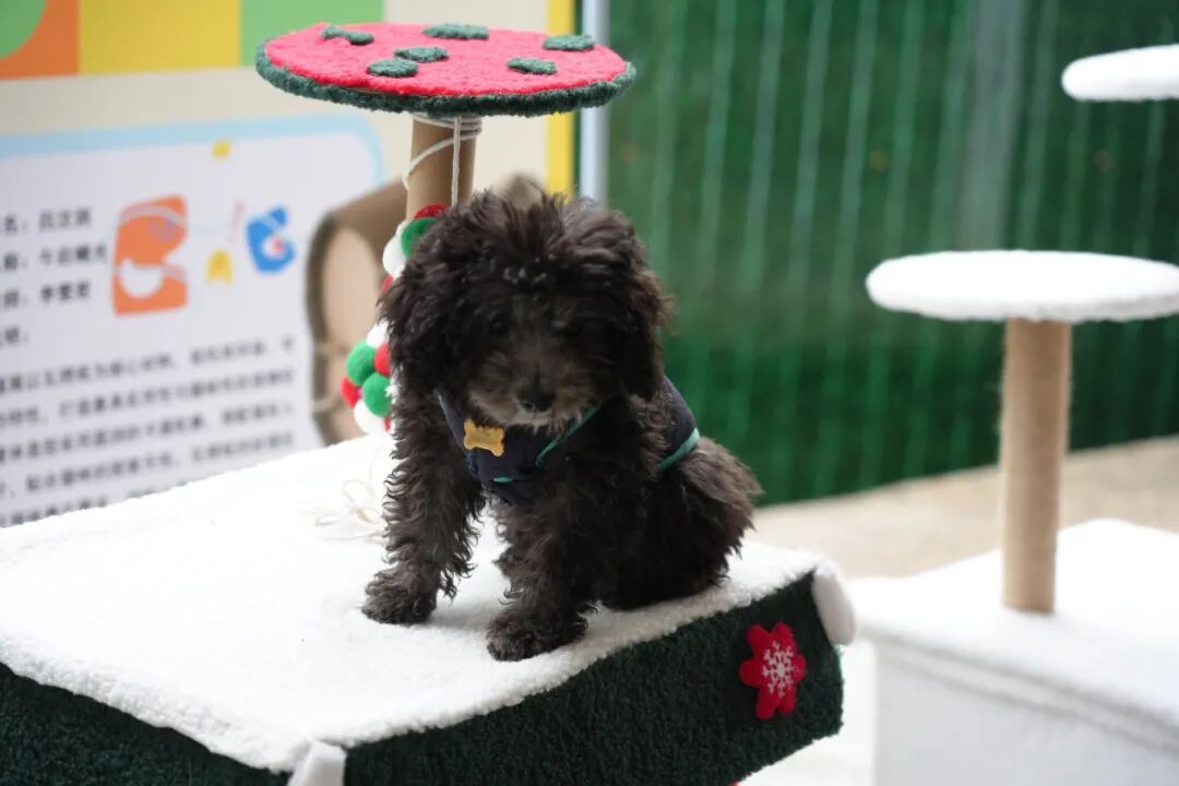 展览现场气氛热烈,学生们将课程中掌握的空间建模与材料工艺知识,应用于宠物主题设计,创造出众多兼具艺术性与实用性的作品,吸引了众多师生驻足交流。在“猫咪之家”展区,宠物猫作为“特邀模特”,与自动逗猫棒、环保猫窝、智能喂食器等学生作品自然互动,构成一幅温馨鲜活的生活图景。“看到猫咪在我们设计的作品中自在玩耍,特别有成就感。”2023级环境设计专业学生黄梦冉的话语中洋溢着专业自信。另一边的柯基犬与泰迪犬则以“产品体验官”身份,亲测“纸筑隧道”“枝桠巢语”等设计,为学生优化作品提供了真实反馈。“与萌宠互动既能抚慰心灵,也帮助我们更精准地理解宠物习性、完善设计细节。”2023级环境设计专业学生吕江滨说道。