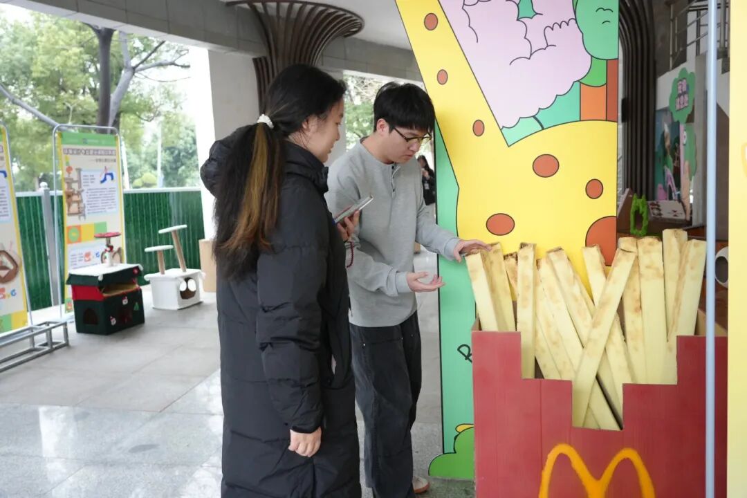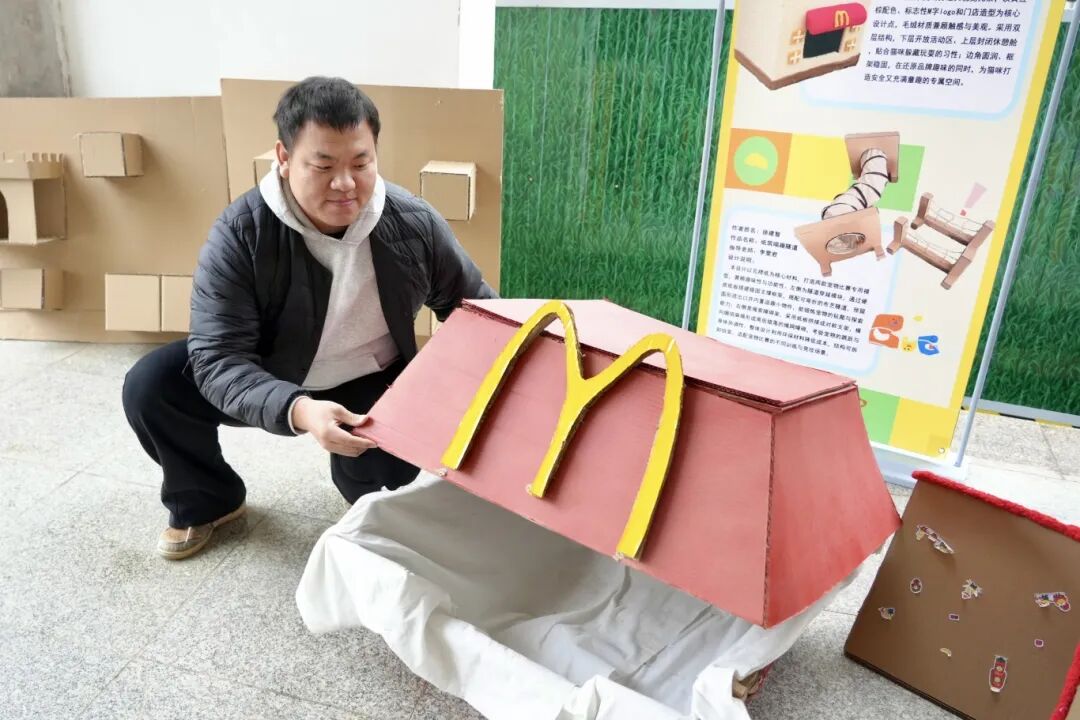 展览入口处,立于拱门两侧的“薯条”与“掌心温室”两件作品格外引人注目。“薯条”作品由2023级环境设计专业学生葛天涯创作,其灵感源于课程中对材料特性的探索。“在《空间模型制作》课程中,我们学习了多种材料的加工工艺。我选择海绵材料,正是看中其柔软安全、可塑性强,适合作为宠物互动装置。”葛天涯介绍道。另一件“掌心温室”则由同专业学生赵梓康使用瓦楞纸精心制作,巧妙融合封闭式安全感和磨爪娱乐功能。“课程训练了我们对空间尺度与功能整合的能力,这件作品就是尝试在有限空间内实现多重宠物需求。”赵梓康的讲解,让现场师生看到了专业知识如何转化为服务生活的实际设计。