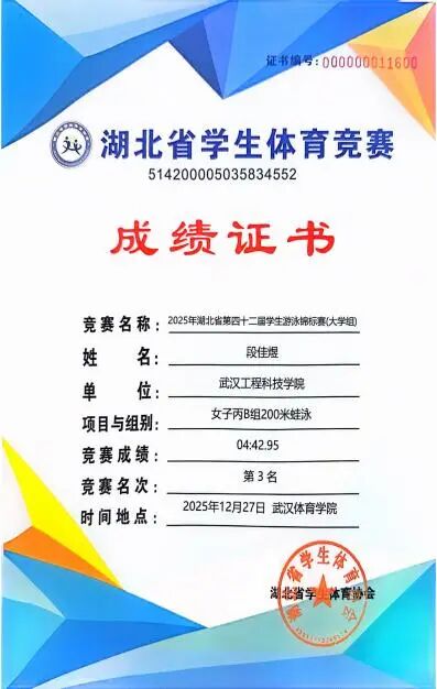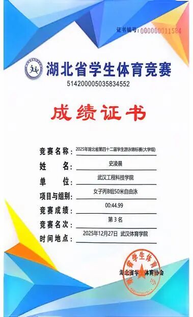 2025年12月27日,2025年湖北省大学生游泳锦标赛在武汉体育学院成功举办。英国beat365官方网站14名学生在郭生鼎、李明老师的带领下,最终斩获女子100米自由泳单项第二名、女子50米自由泳单项第三名、女子200米蛙泳第三名。