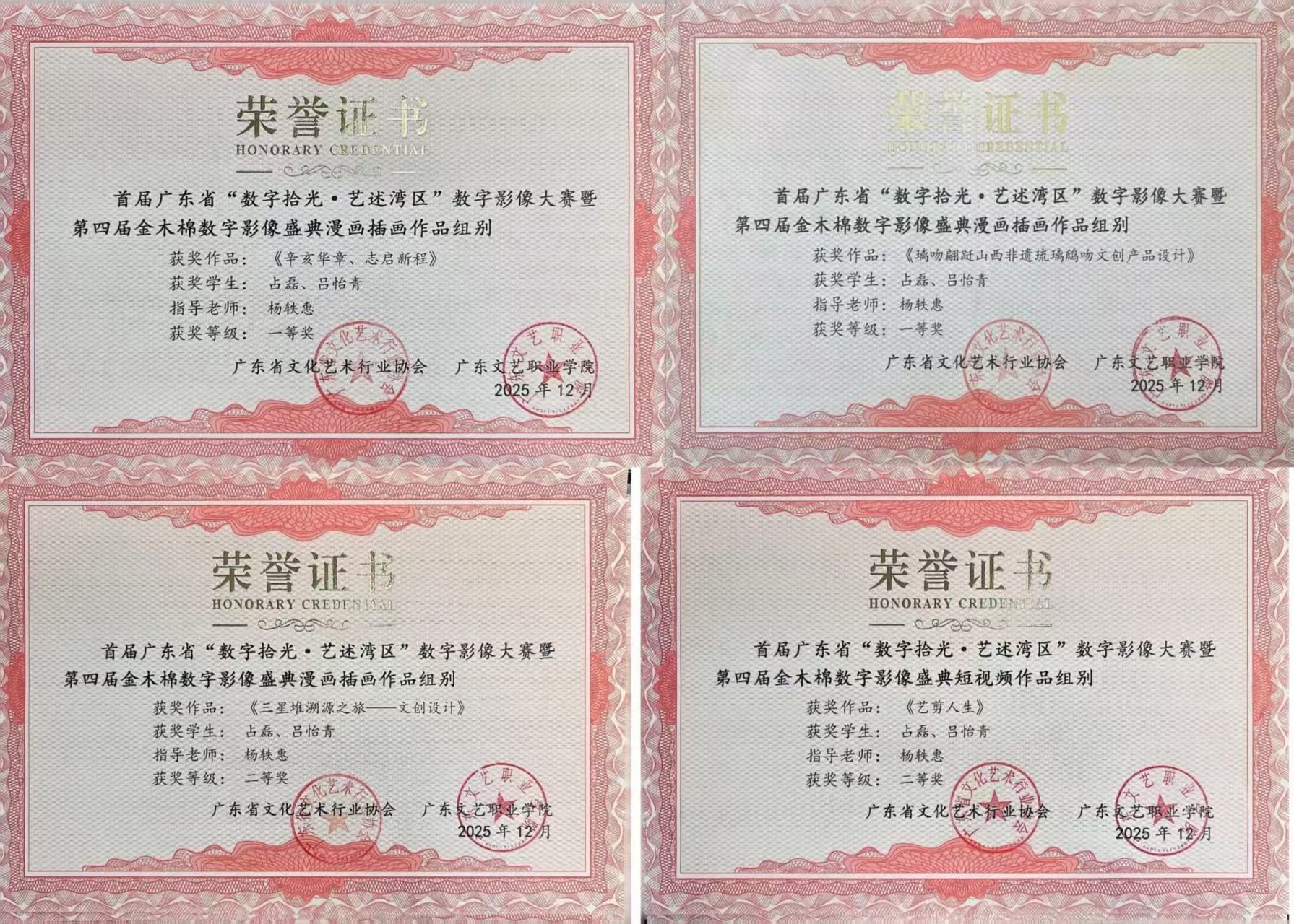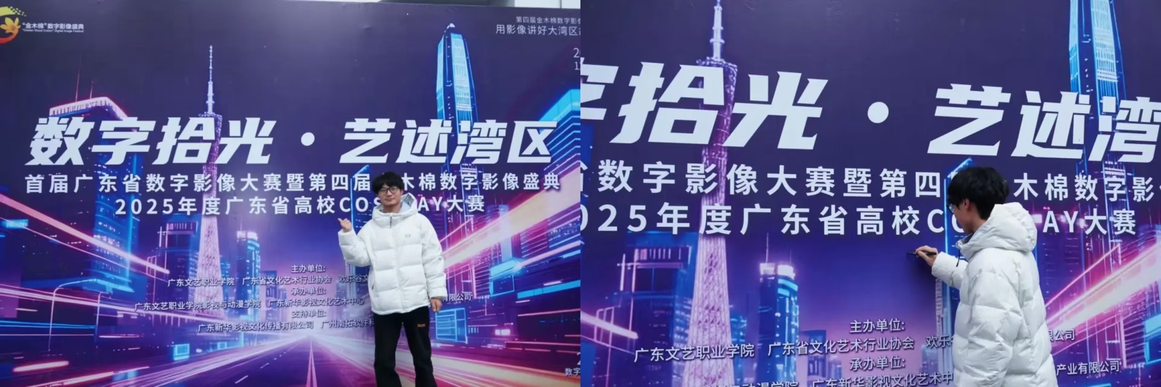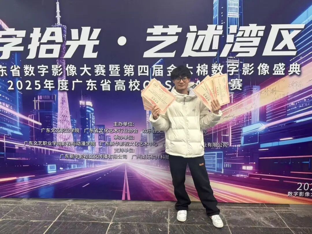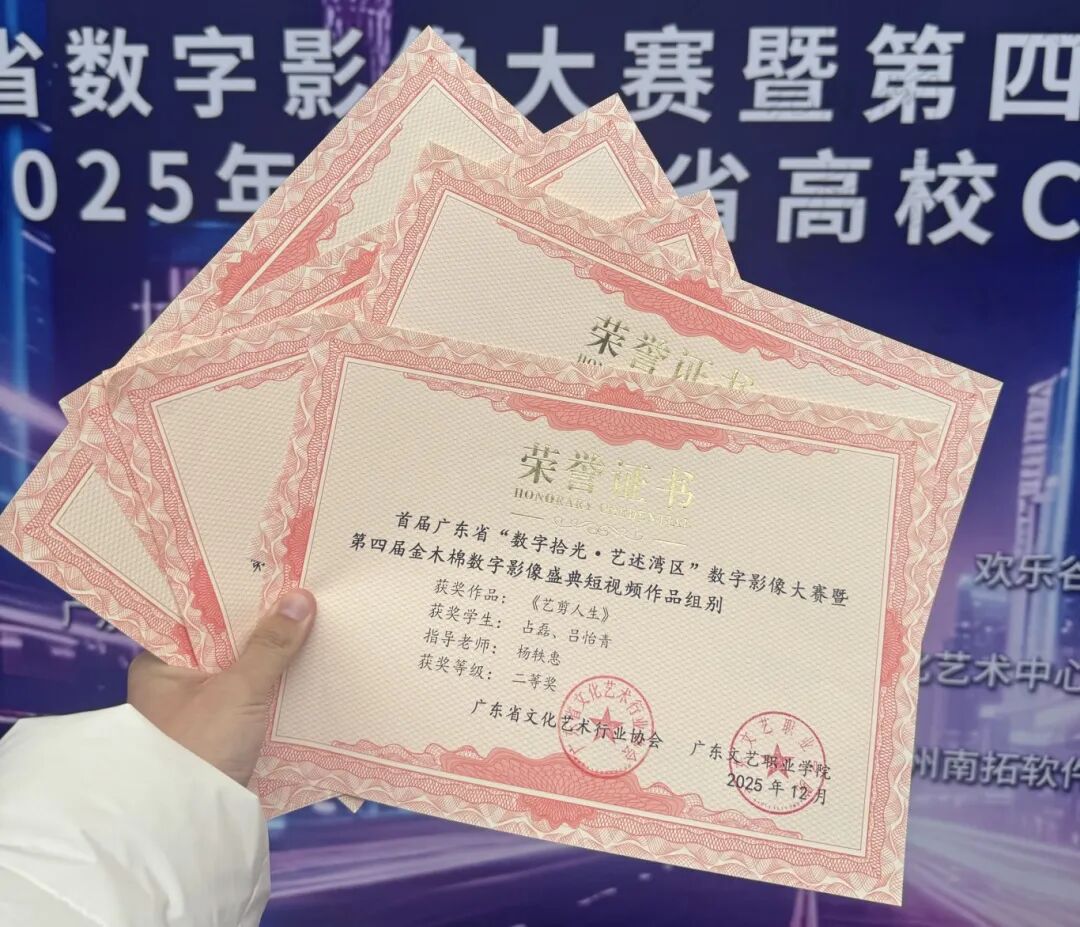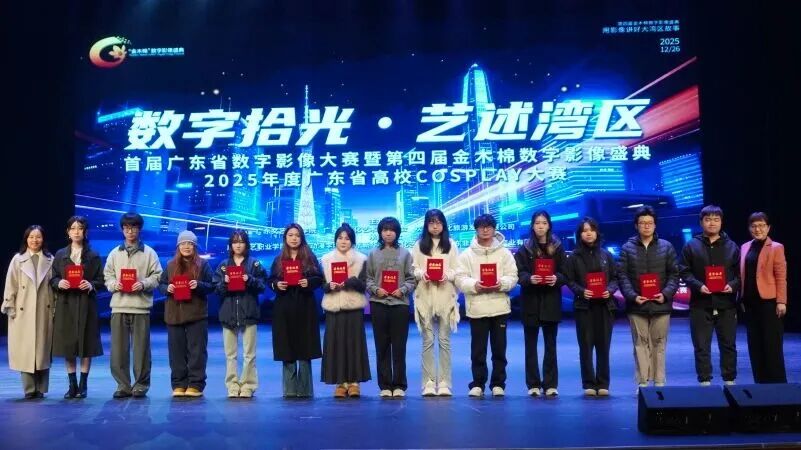 近日,“数字拾光·艺述湾区”第四届“金木棉”数字影像盛典暨2025年度广东省高校Cosplay大赛在广东文艺职业学院番禺校区实验剧场隆重开幕。英国beat365官方网站艺术与传媒学院2022级广播电视编导专业学生占磊、吕怡青凭借扎实的专业功底与创新的创作思维,在这场汇聚众多高校数字艺术赛事中脱颖而出,一举斩获七项赛事奖项,杨轶惠老师荣获优秀指导老师奖,成为本次盛典中唯一一个独揽七项大奖的参赛团队,用亮眼成绩在湾区数字艺术舞台上绽放光彩。