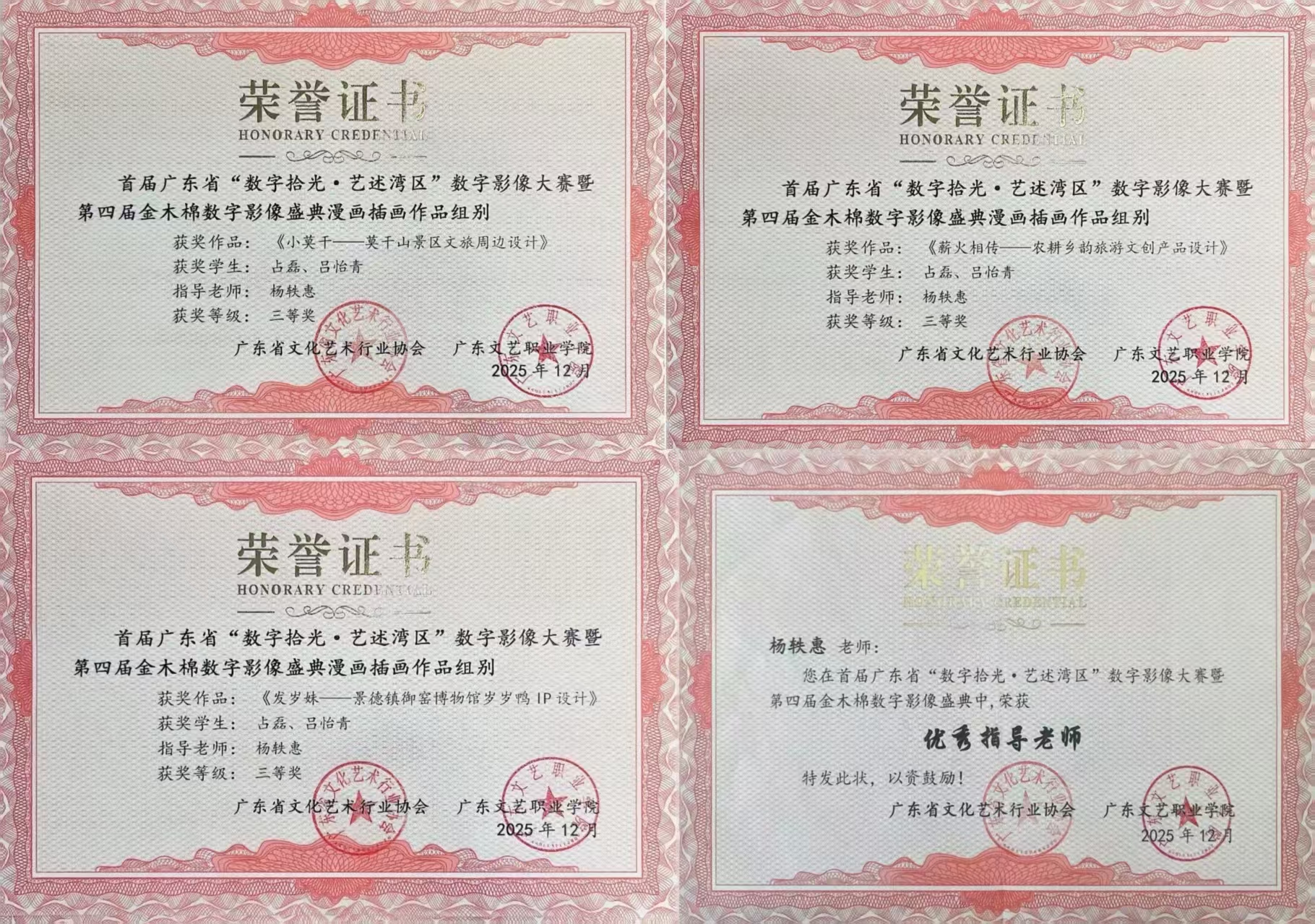 在漫画插画赛道,我校学生占磊、吕怡青展现出强劲的创作实力与多元的创意视角,一举包揽6项奖项,实现了该赛道一二三等奖的全面覆盖。其中《辛亥华章、志启新程》以厚重的历史底蕴与新颖的视觉表达,生动诠释了辛亥革命精神的当代传承;《璃吻翩跹山西非遗琉璃鸱吻文创产品设计》则深挖传统非遗元素,将古老琉璃鸱吻文化与现代文创设计相融合,凭借独特的美学风格与实用价值斩获一等奖。《三星堆溯源之旅—文创设计》围绕三星堆古蜀文明展开创意构思,用插画语言重现神秘古蜀风采,荣获二等奖。此外,《小莫干—莫干山景区文旅周边设计》《薪火相传—农耕乡韵旅游文创产品设计》《岁岁妹—景德镇御窑博物馆岁岁鸭IP设计》三件作品,分别聚焦文旅景区、农耕文化、非遗博物馆等主题,以鲜活的创意与细腻的笔触斩获三等奖。