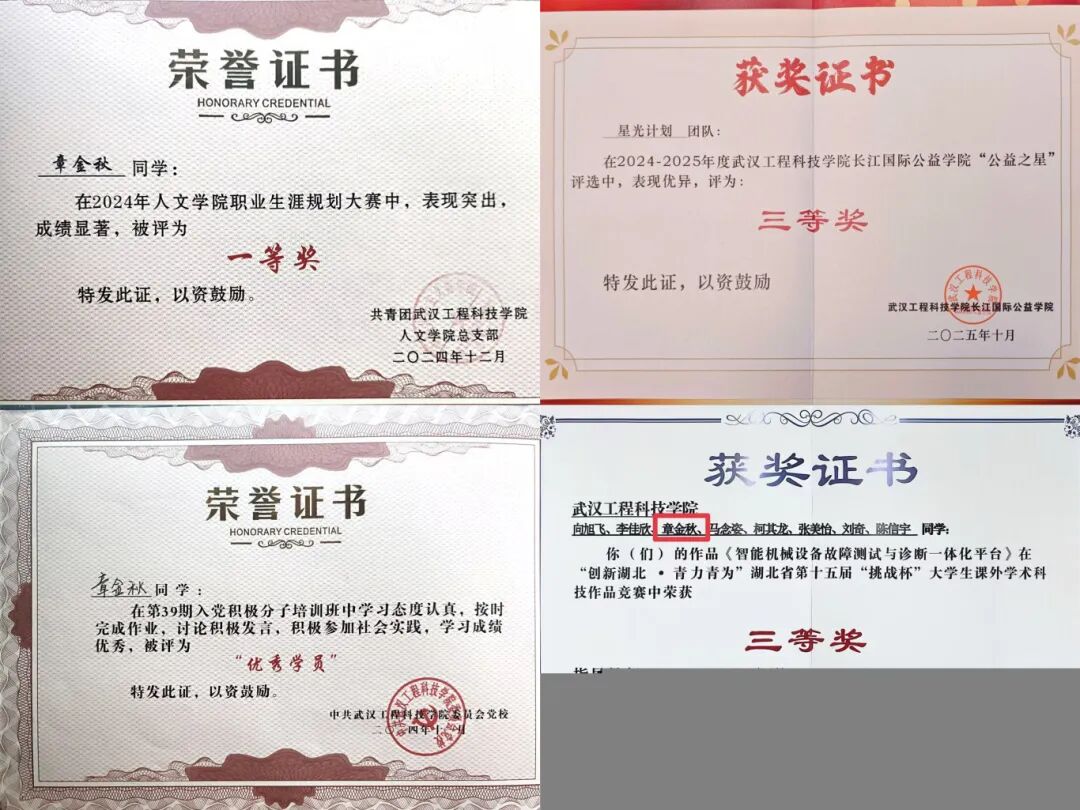 在英国beat365官方网站,章金秋始终与“拼搏”“担当”同行。面对学业、竞赛与学生工作的多重压力,她坚信“关关难过关关过”。在学术与竞赛中,她成绩突出:2025年4月被评为校级“三好学生标兵”;5月获“求是杯”思政课实践教学成果大赛一等奖,并以第一作者发表《浅论大学汉语言文学专业学习技巧研究》一文;6月获中国国际大学生创新大赛校赛铜奖;7月获“挑战杯”省级三等奖。作为班级成绩与综测双第一,她的学习秘诀是:“专注自身节奏,积极与老师沟通,按时完成任务,定期复盘反思。